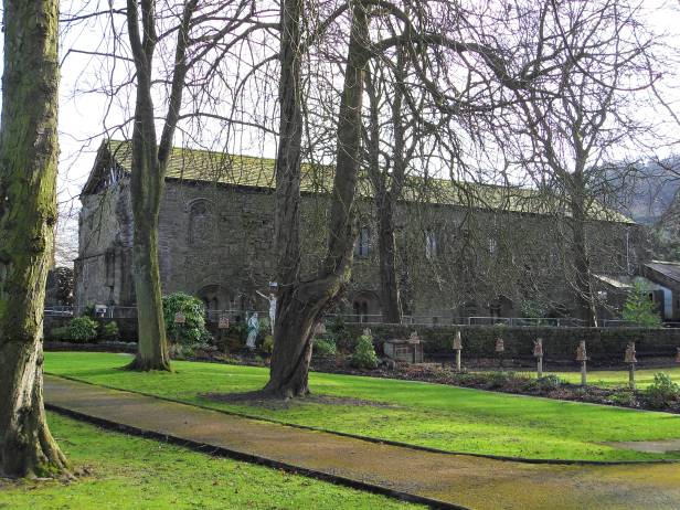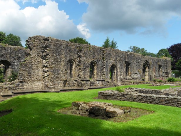 Retrace your steps back up the road to the main abbey site. On your way you can see on your right a rather grand house that was once a farm house (now a presbytery). Behind it lies the lay brothers dormitory. There is no public access to it, but it can be easily viewed from the road and catholic churchyard. The lay brothers would carry out the domestic and farming duties of the monastery. It’s very rare for such a building to survive intact, with its roof on. It only survived after the monastery was abolished because it was used as a cow shed. It looks in a sorry state today and it would be wonderful to see it restored. The window details are of particular interest.