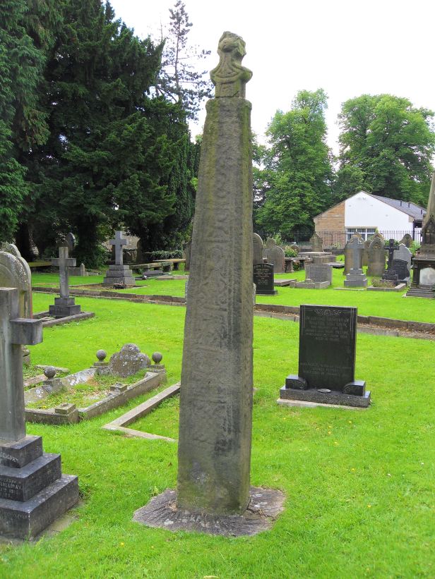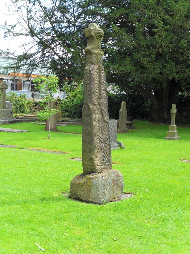 The second cross in the churchyard (pictured below) is very different in appearance and is perhaps of the later Viking era (eleventh century). No figures of humans or animals, but huge scrolls cover the main body, along with zigzag and triangular patterns. Each of the four sides of this cross shaft are impressive and worthy of careful examination. The cross head could well belong to the shaft, although its clear that a large part of the upper shaft is missing. The impressive socket stone the cross sits in has a dog tooth pattern, similar to ones on the shaft, which implies it could well be the original.
