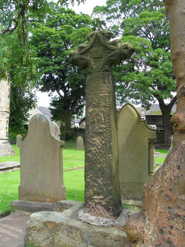 The third Viking age cross is a very odd looking monument. Firstly, the cross head on top is of a late medieval date, so nothing to do with the Viking shaft below. The shaft is set in a large double socket stone, but it is not known if this is the original. The second socket of the stone has been cut away at some unknown date. Double socket stones are rare, but there is one in Haslingden (click here to view our page on it). The top and bottom of the original shaft are missing, and the markings on the rest are very faint. However, in the right light two human figures side by side can be seen. The shaft dates from the 10th Century.