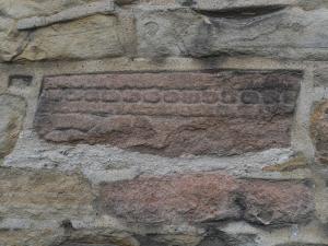 in the stonework of the church itself both on the outside and the inside, and other pieces are also stored within the church. One of the easiest pieces to observe is found in the south wall just opposite the double socketed cross described above. It is a well preserved shaft just under the lancet windows, on the south side of the church, and can be seen in the photograph to the right.