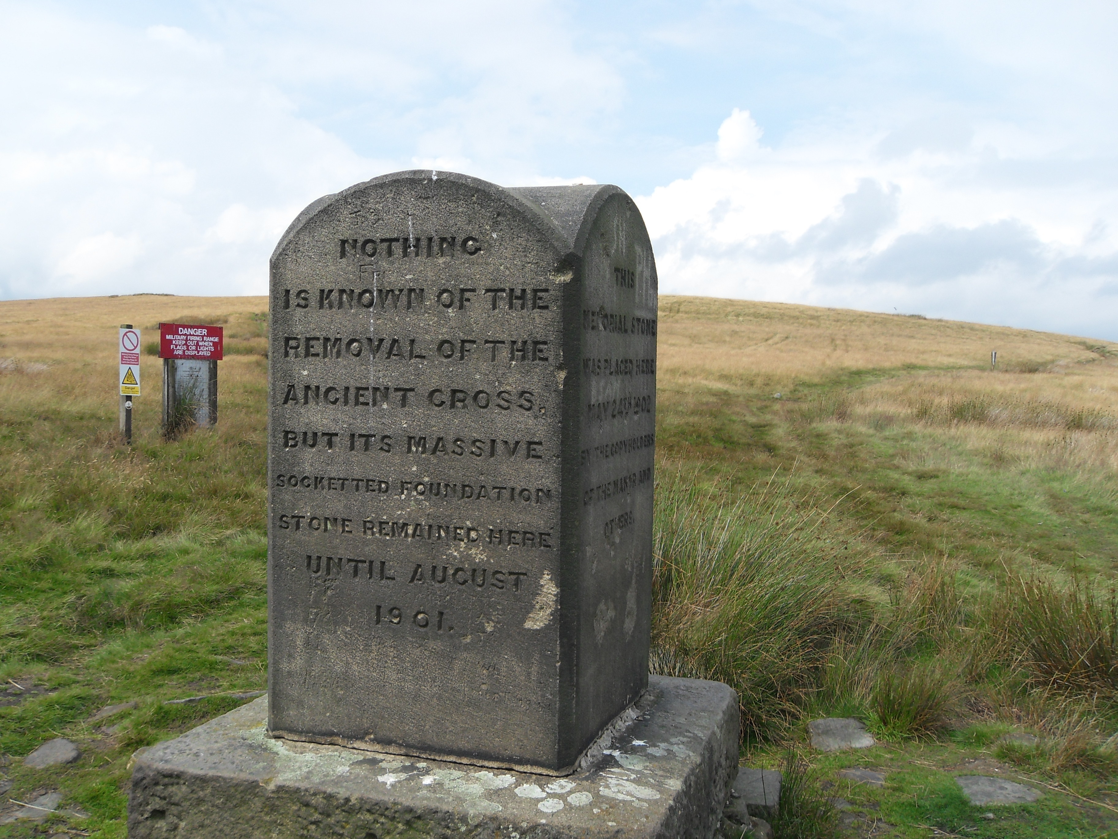 The monument is on a footpath that is a public right of way. The grid reference is 772 183 and is marked as “stone” on the OS map (West Pennine Moors, Explorer Map 287). Close by is Ministry of Defence owned land (as can be seen in the above picture) so stick to the path and watch for red flags flying.