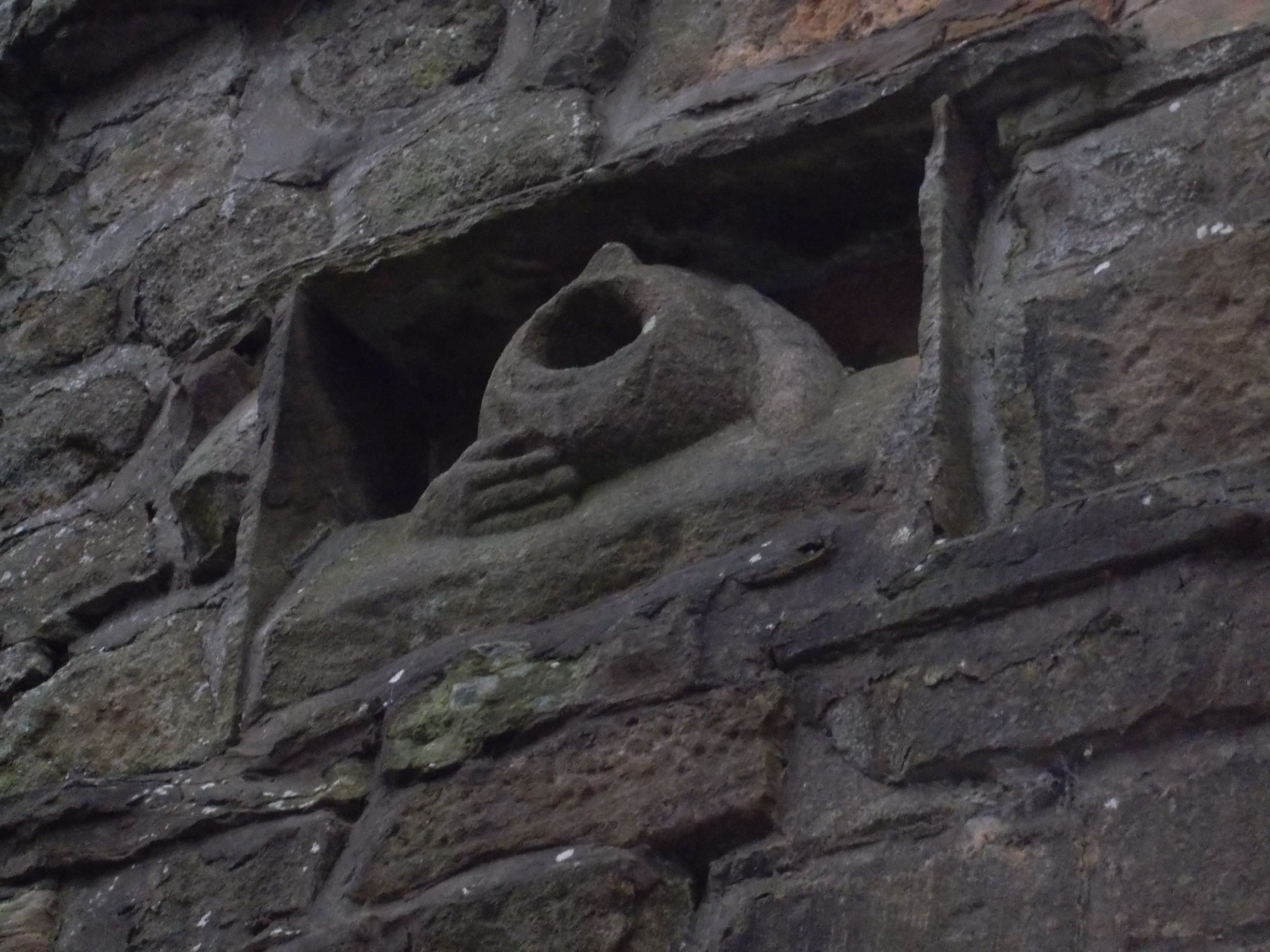 The icehouse has an unusually shaped door, called an ogee. Either side of the door are two carved figures, probably from the church and dated to around the 1500s. They sit on two corbels that were clearly not designed to hold them. Other carvings include three shield shapes and a block with a hollow spandrel. There’s no access to the inside of the ice house, but if you take a few steps up the path to your right, you can see it has a large mound behind it.