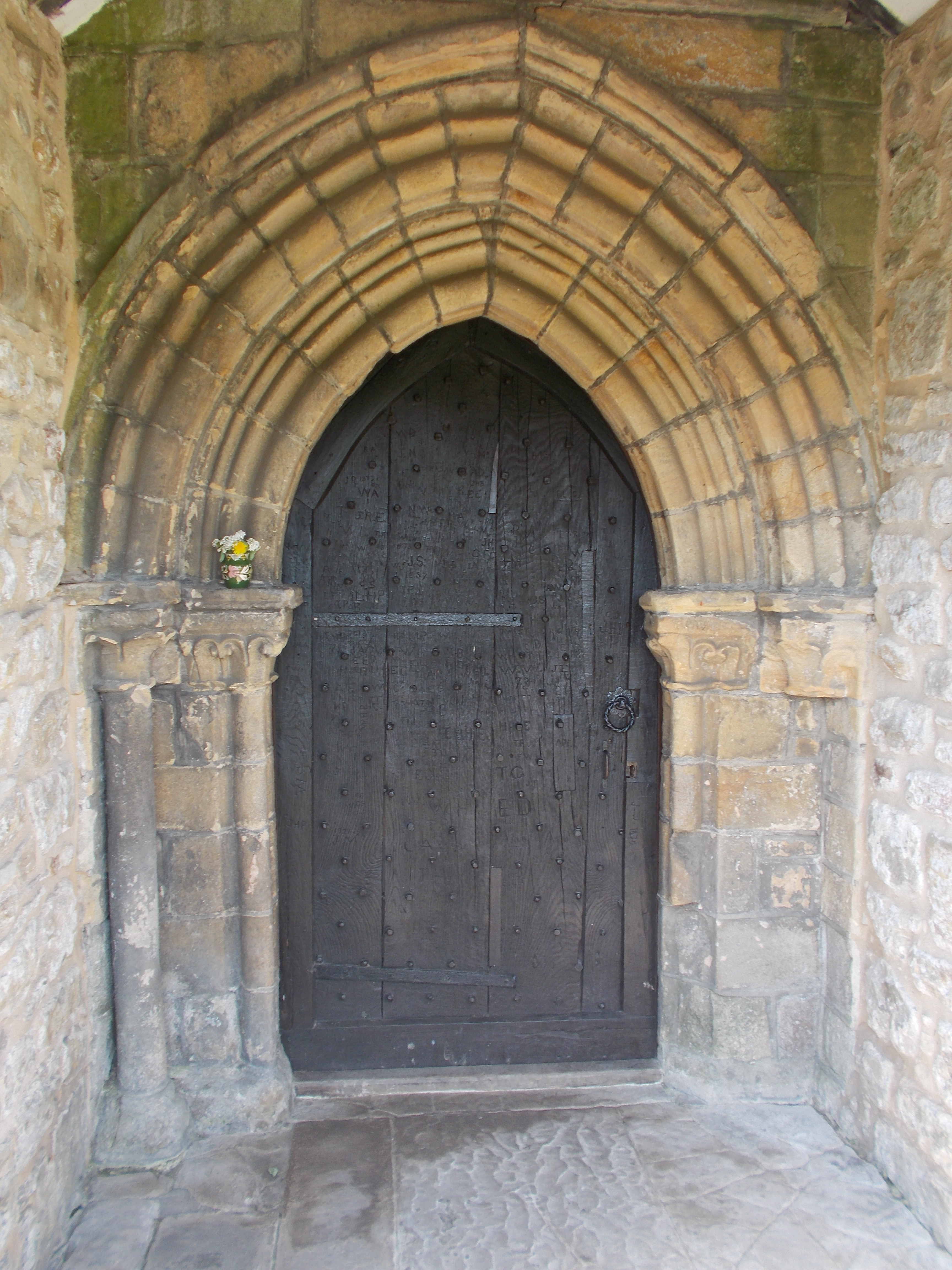 Today we can see architectural features from all of this long history. From the outside on the North wall we can see a blocked Norman doorway with characteristic dog tooth patterning above it. The original is on the other side, leaning against the inner wall. Two narrow Norman windows can be seen either side of this doorway. The South side porch contains an impressive doorway from the Early English period (1200s), showing deep mouldings and columns with capitals either side. The studded oak door is suitably robust.