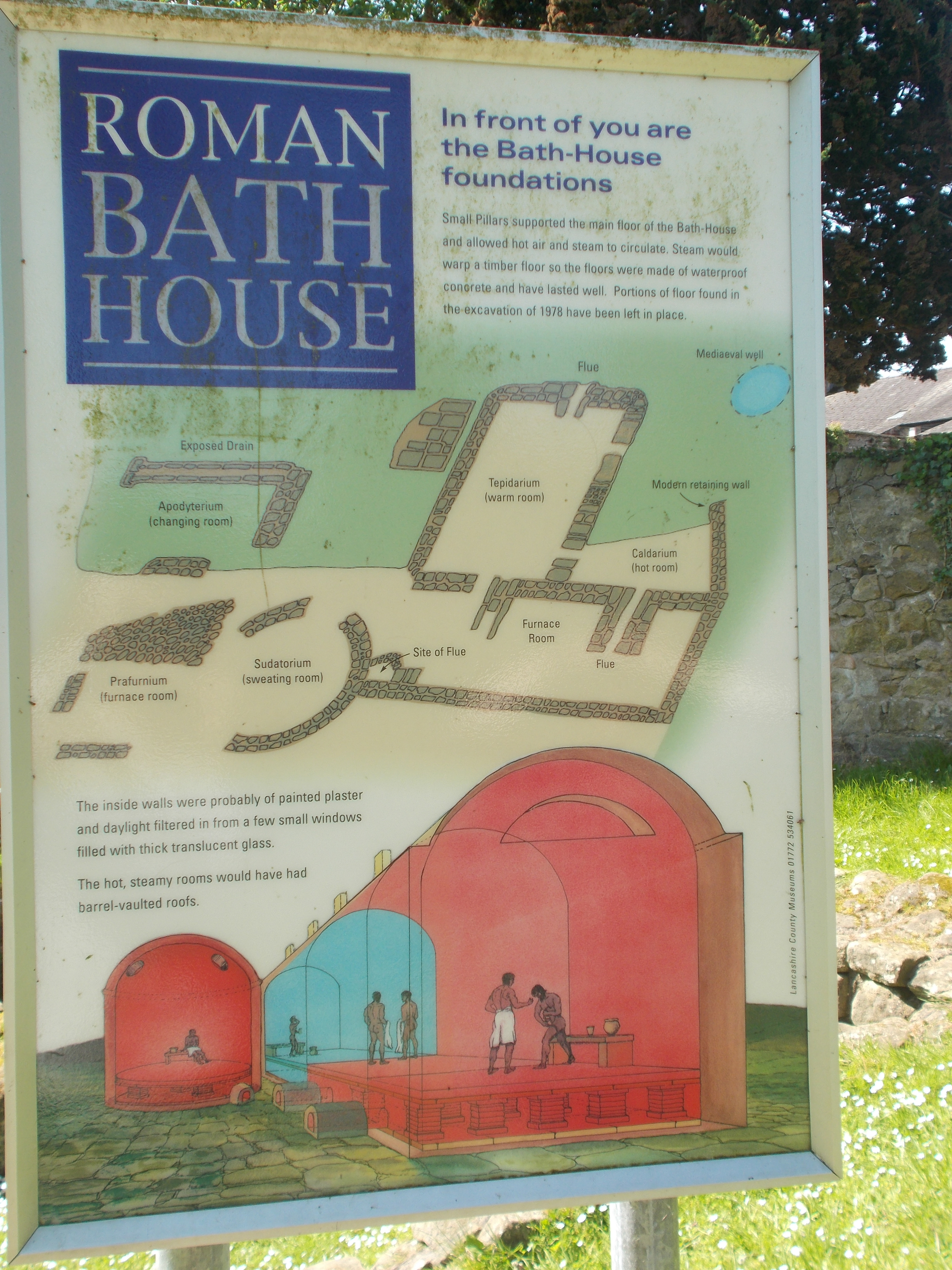 The bath house at Ribchester consisted of a number of rooms each with a different function. These included an apodyterium (changing room) and frigidarium (an unheated room with a cold plunge pool). A furnace room provided warmth to three rooms that would have had needed under floor heating. These were the caldarium (hot and moist room, with a hot bath), the laconium or sudatorium (a circular, hot and dry room like a sauna), and tepidarium (a warm room, just to sit and relax in).