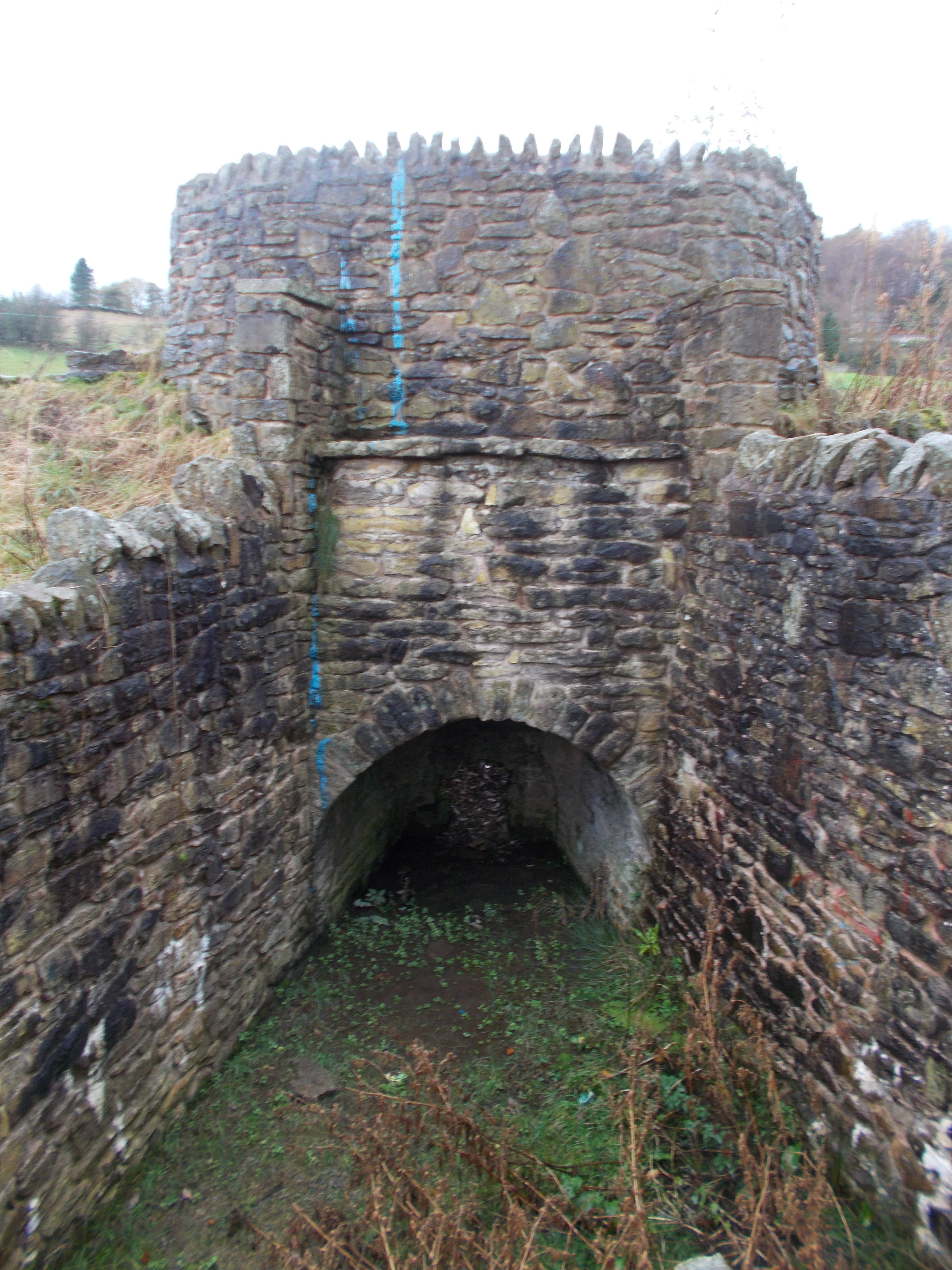 The lime kiln dates from the opening of the Leeds and Liverpool canal, being built sometime between 1790 to 1796. Limestone was needed in great quantities to produce lime mortar required for the canal building project. The mortar was used in the construction of all the bridges, locks, tunnels, resevoirs, walls and even the clay lining at the bottom of the canal. The kiln we see today was one of two, each one built either side of Foulridge Tunnel. It is a ‘draw kiln’. This type had coal and limestone added in alternate layers, put in through the top of the kiln, before the kiln was lit. The product- the burnt lime, would be drawn out through the support bars at the bottom of the kiln.