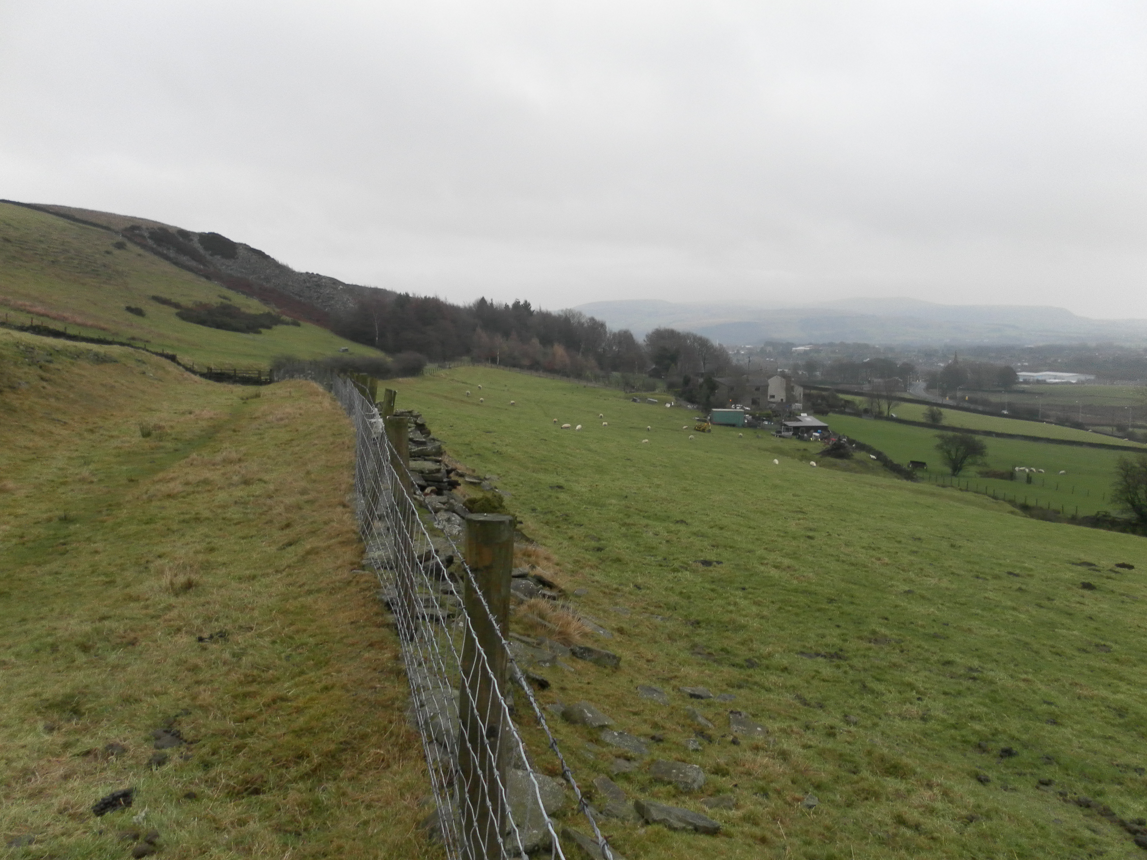 The track crosses over several stiles, past the back of Kettlewell Hall until you meet the road up to Clod Farm and Windy Harbour Farm. At this point, the choice of path is confusing: do not take the road up or down the hill. Keep on the path heading west, but do not go over the stile into the field heading towards Leys End. Instead follow the sunken lane by the hawthorn trees. As the row of trees end, look over to your left into the field above Leys End. In this field is a slight depression, and a trace of a path down to Leys End. The map in “Grane Revisited” shows the cross at the spot of the depression. There’s nothing to see of it now, of course, but there is a great view of Odgen and Holden Wood Resevoirs and the hills beyond.