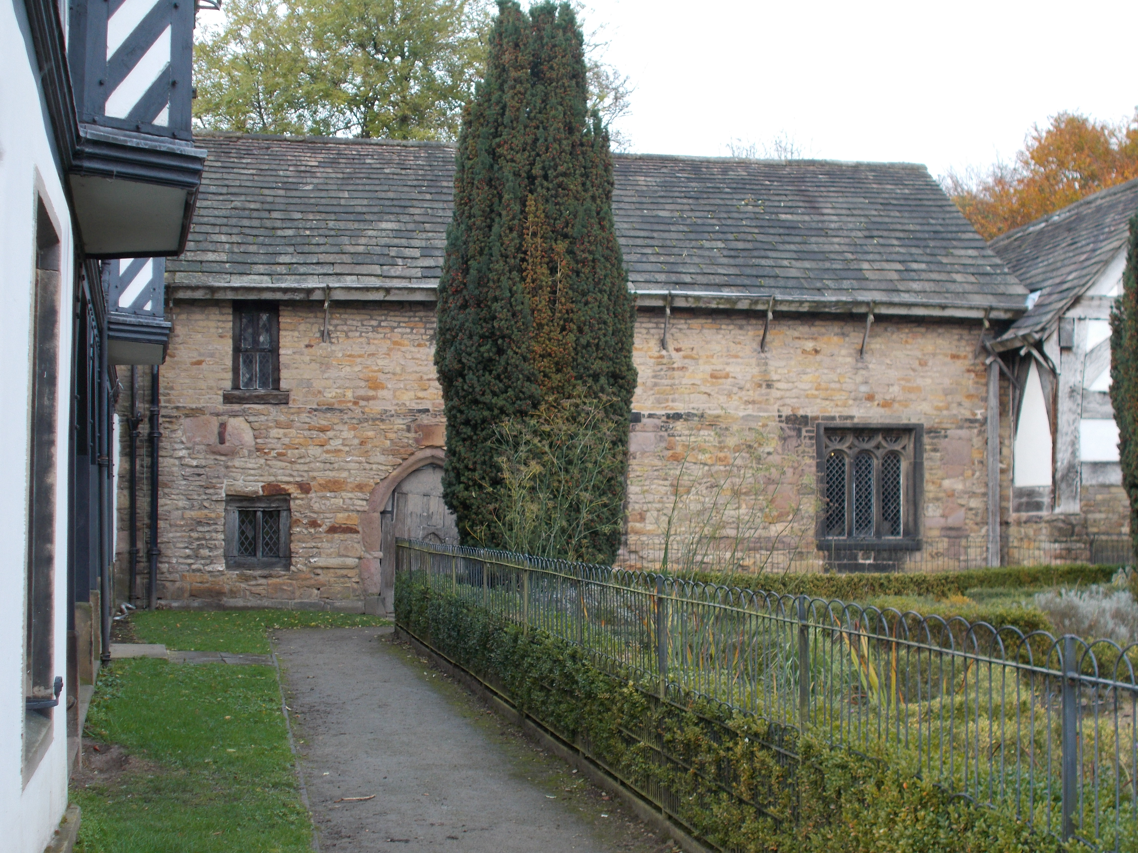 Radcliffe Tower would have been connected to a Medieval Great Hall, which would butt up directly against it. The Great Hall would be a timber frame building, consisting of a huge open room. At one end would be a large table where the family ate. At the other end would typically be doors leading to a buttery, pantry and kitchen. These would be blocked off from view by a large moveable wooden screen (an rare surviving example of which can be seen at Rufford Old Hall). The footprint of the Great Hall has been laid out in the grass on the site today, so you can get a feel for its size. For an idea of what both the outside and the inside would have look like, visit nearby Smithills Hall at Bolton (see here). It was built in the same era and its Great Hall still survives to this day. It was also owned by the de Radcliffe family.