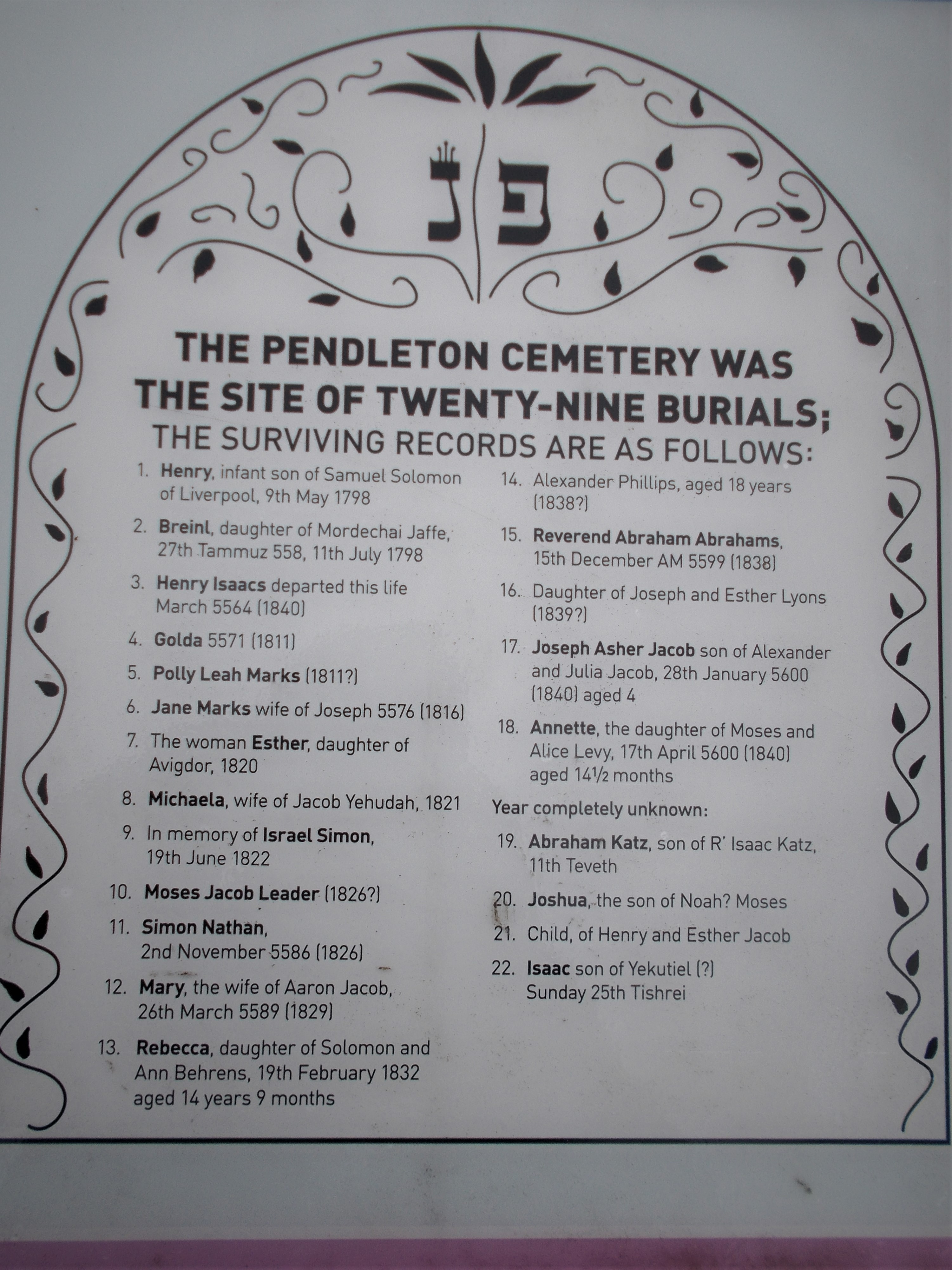The Pendleton cemetery had 29 Jewish burials and records of most of these have survived- although they are very brief. Click the photo opposite to read them from the on site interpretation board. Today, five of the surviving gravestones are arranged radiating out from a central pentagon shape (again not in their original position). There is also a six pointed star of David patterned into the pavement just next to the plot.
