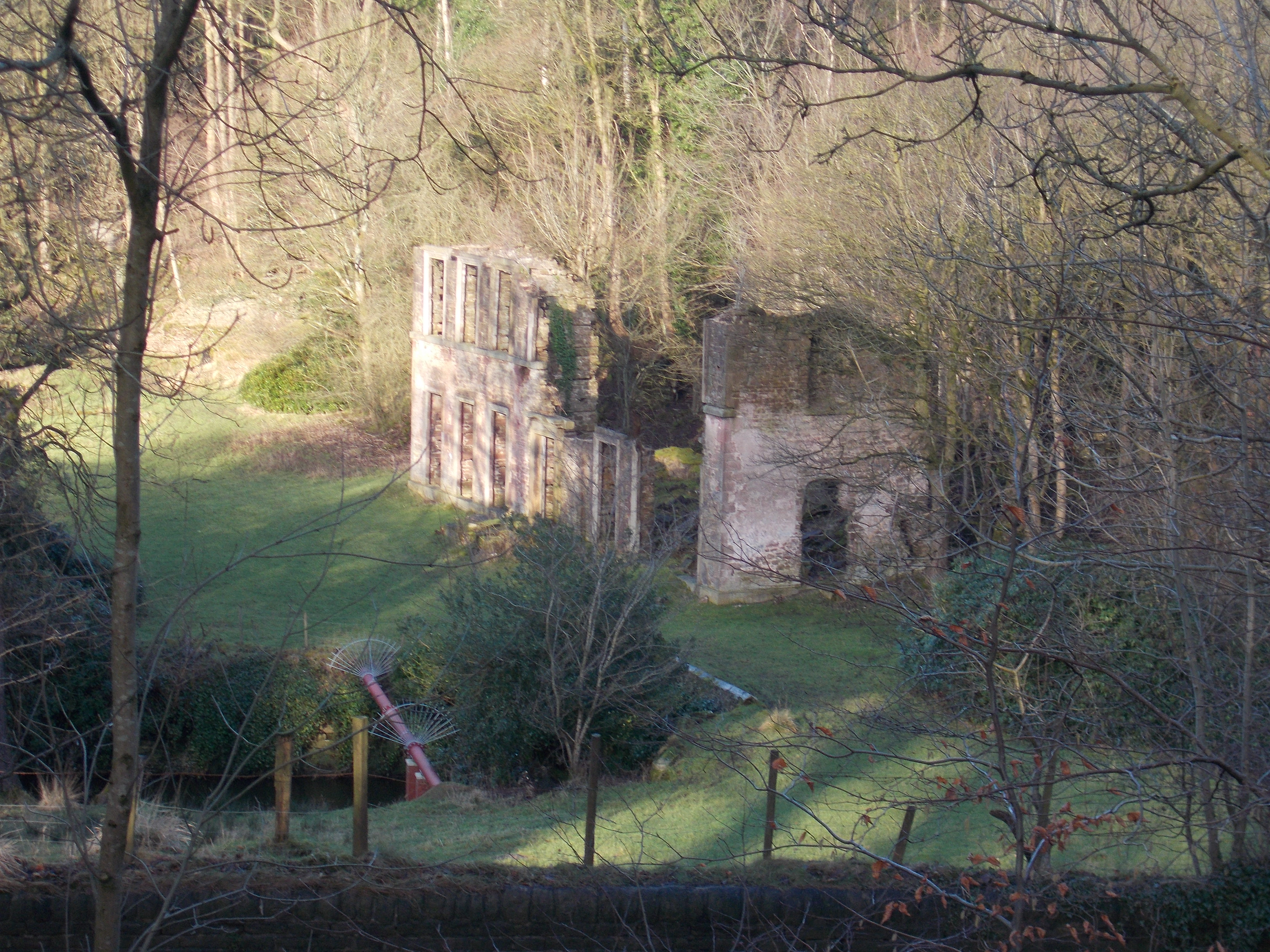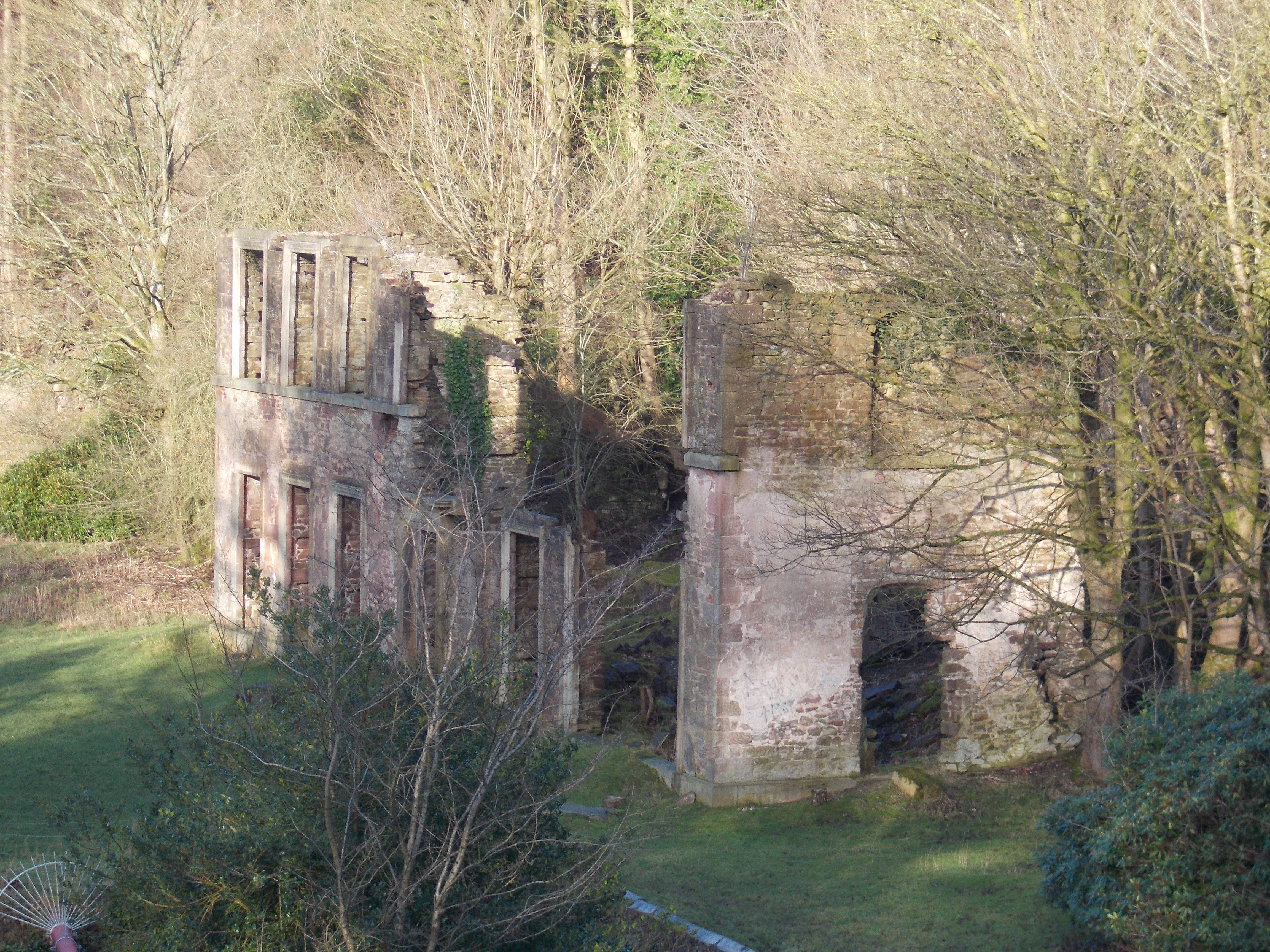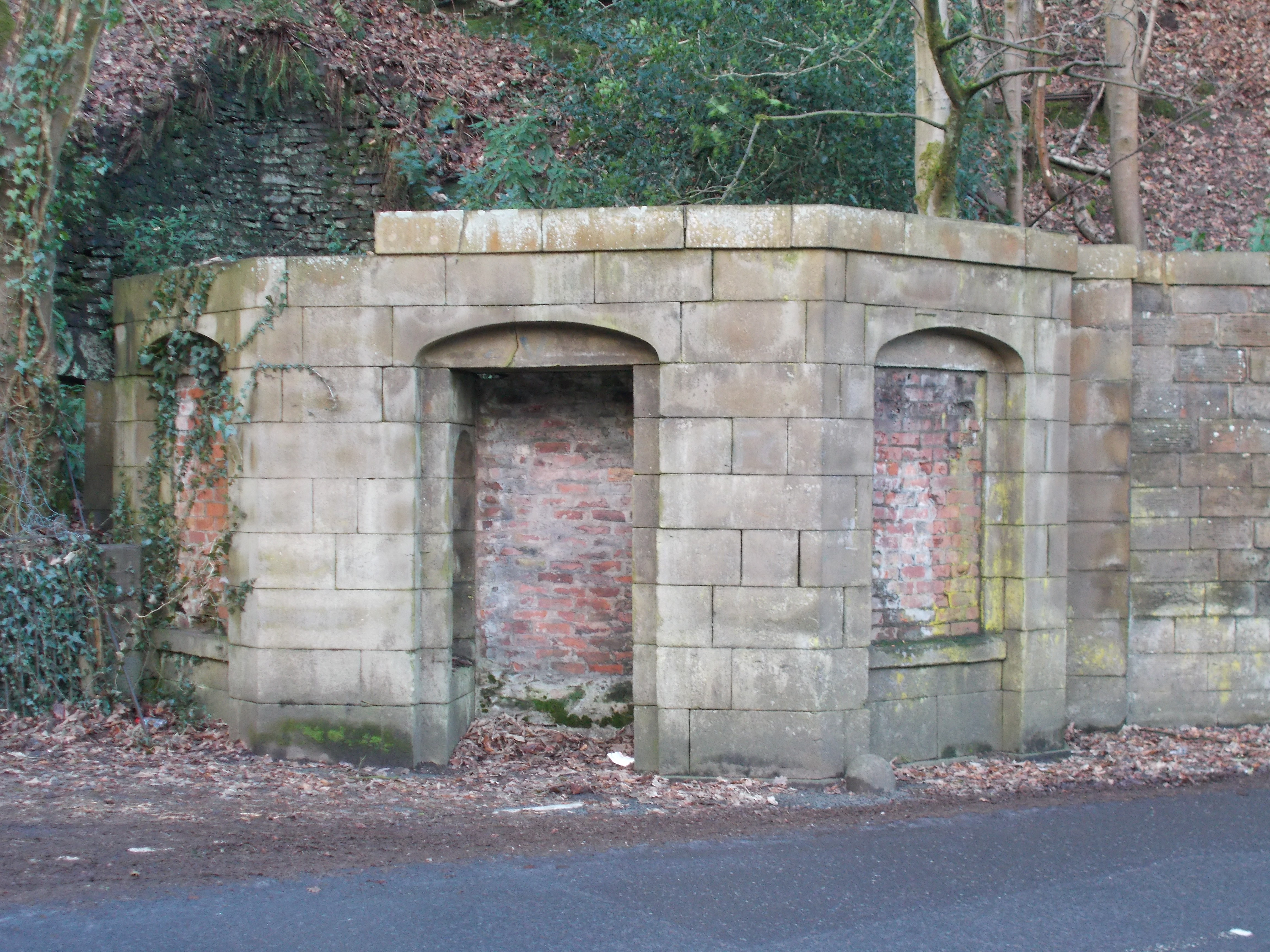 Retrace your steps and head back down Preston Old Road, passing the Pleasington junction on your right. Note the exposed timbers on the side of Sun House. Keep on going downhill past the church hall. The main road cuts through the deer park and you can see the steep escarpment with a beech woodland on your left, and the grounds of Feniscowles Hall on your right. Through the trees you will start to spy the ruined hall, and as stated before the best time to see it is in winter when it is not obscured by leaves. The front part of the hall is the largest part still standing, but if you compare the current view with the historical you can see that much of the side wing is now gone (see the top two photos above). Keep going until you reach the second lodge house, gate posts and carriageway. This is a more substantial building than the first and a glance over the wall will reveal what looks like lower stories and a slipway to the river.