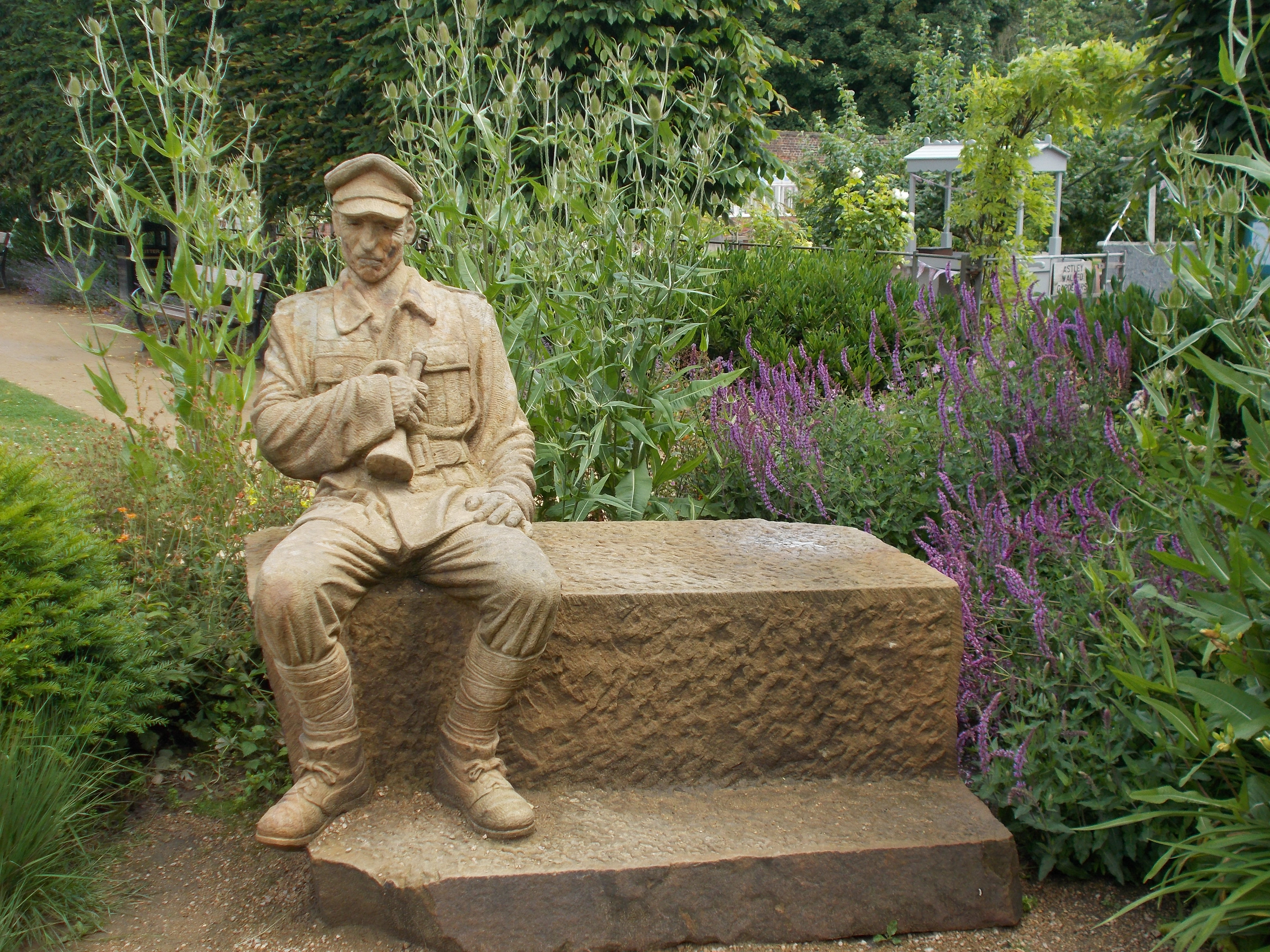 Chorley born John Everiss has designed two commemorative memorials for the park. His most recent one is the Garden of Reflection, which uses elements that would have been familiar to the Chorley Pals in the First World War. These evoke the structural designs of the trenches: a steel roof, timber uprights and duckboard flooring. Artillery shells from Serre in France, the point at which the pals would have gone over the top into battle, are embedded into the walls.