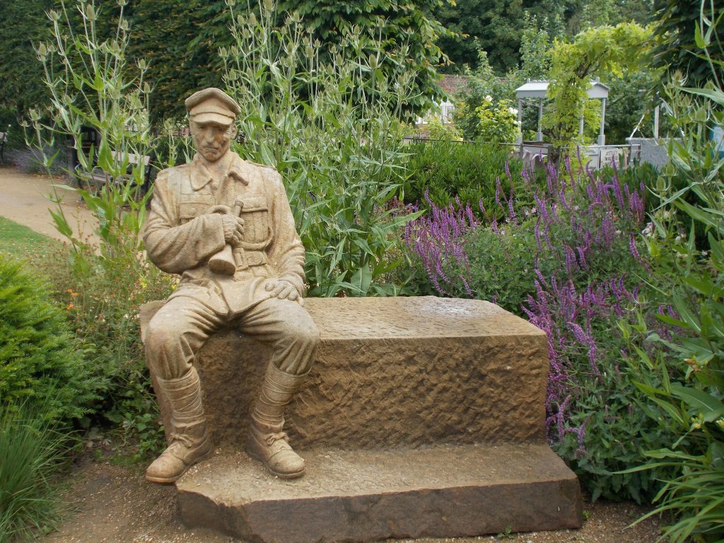 From the Sensory Garden it is a short walk to the original memorial cross, wooden soldier sculpture and the recently added stone plaques that list all of the fallen in both world wars and subsequent conflicts. Head out through the large memorial gates and turn right to view the drinking fountain in the wall.