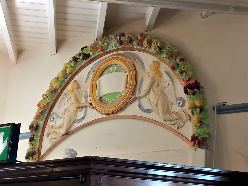 The Reading Room Café is very popular and is open to the public every day of the week. This has a number of interesting features. The fireplace carries the motto Fire Makes Fast Friends. Above this is a painting of St George and the Dragon and close examination reveals an inscription from the time of the Barlows: As St George in armed array did the fiery dragon slay, so mayest thou with might no less slay the demon drunkness. Above the entrance door is a painted moulded plasterwork featuring two angels, holding aloft a medallion. The scroll at the centre of this is blank, and it is not clear if there was once something painted on it. The Edgworth Art Triptych entitled Past and Present was created by the art group in 2018. It features local landmarks such as Edgworth Methodist Chapel, Turton Tower, the chimney at Quarlton Vale Works and the reservoir of Old Russia, along with the institute itself.