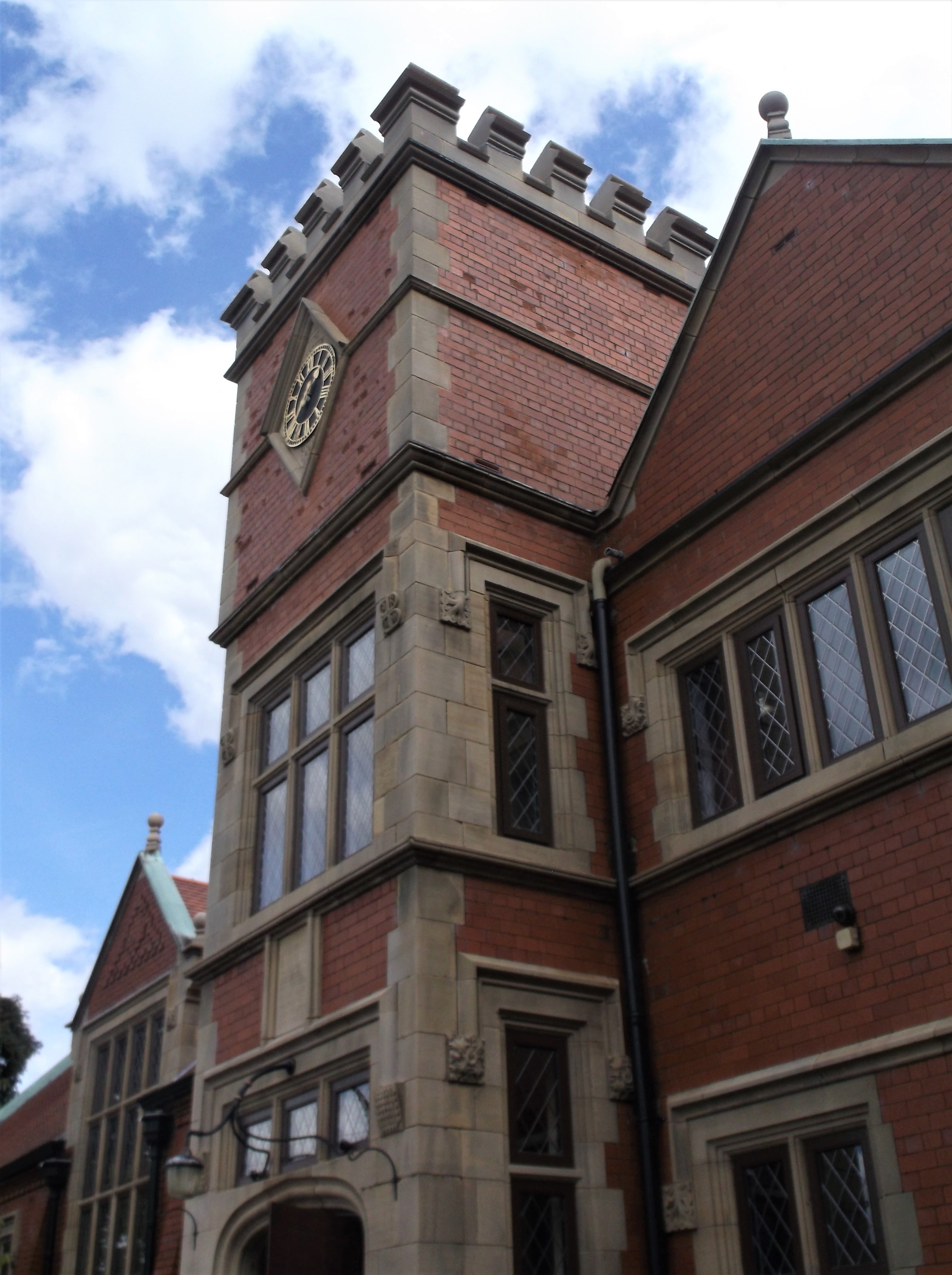 The cricket ground was the first of the facilities to be completed and was in use by 1898. Three years later, a pavilion had been set up and that same year the bowling club began. Subsequently, an open air swimming pool, maze and boating lake within a woodland park were added. The building itself was constructed in red brick in the Arts and Crafts style, and designed by architect George Faulkner Armitage. With a central tower entrance way topped by crenulations, and mullioned windows with leaded glass throughout, it was and still is an impressive structure.
