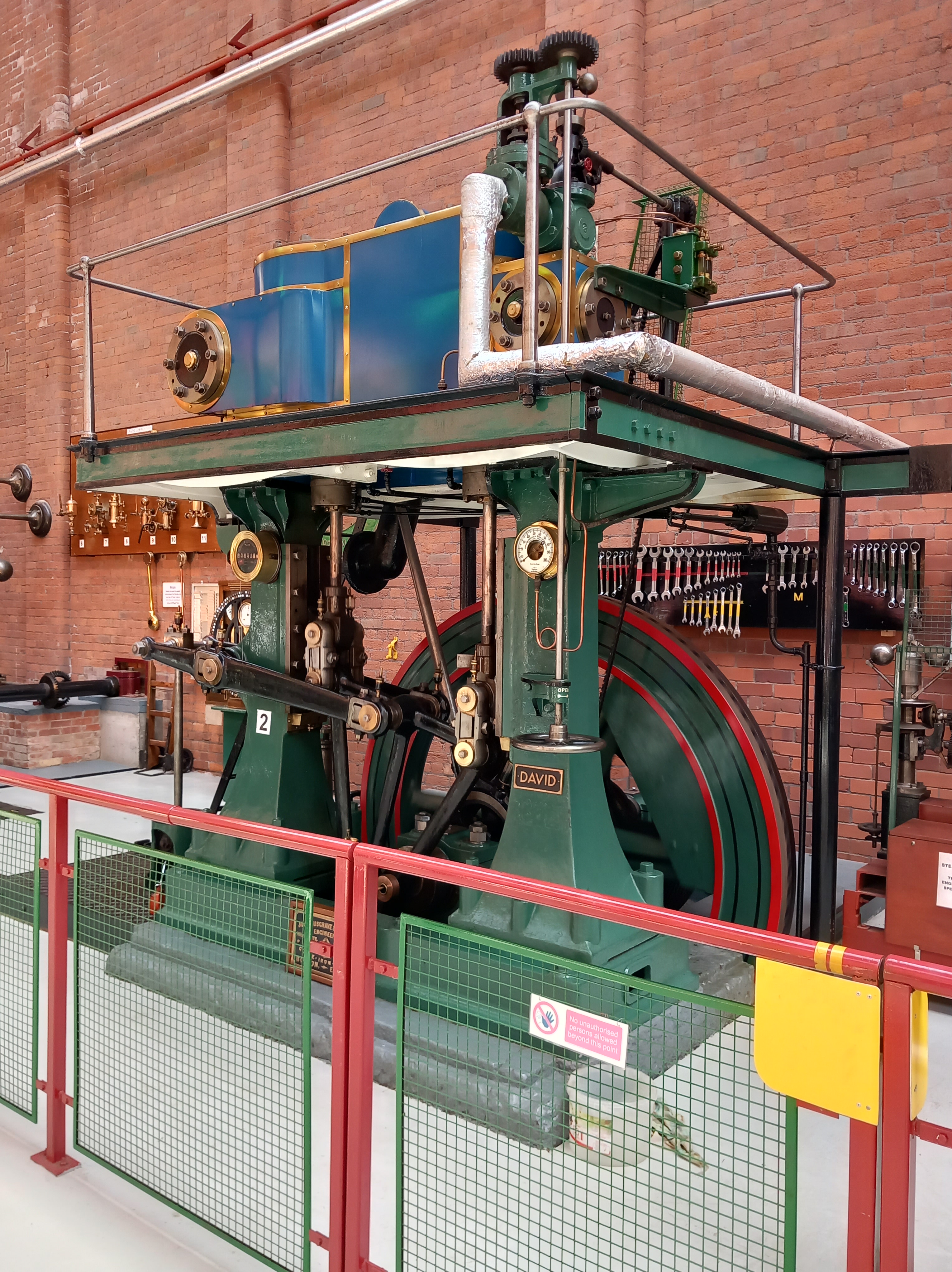 A small machine of note is Fred Dibnah’s Bennis ‘Westminster’ engine. Fred, the local Bolton steeplejack and well known television presenter, was at one time the president of the Northern Mill Engine Society. Fittingly, his sons have loaned his engine that he used to drive his steam workshop in his garden. He used to power many of his metal and wood-working machines by steam.