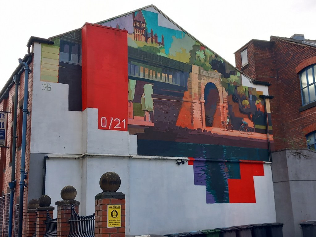 Mile 0/21 is by Gavin Renshaw, and is the first mural of the original Paint Preston campaign, set up to reflect and promote Preston’s heritage. It depicts the official start (and end) of the Guild Wheel walk, created in 2012 as part of the Preston Guild celebration. The painting shows the East Lancashire Railway Bridge in Avenham Park, with the Park Hotel in the background. A pair of cyclists are seen heading under the arch of the bridge.