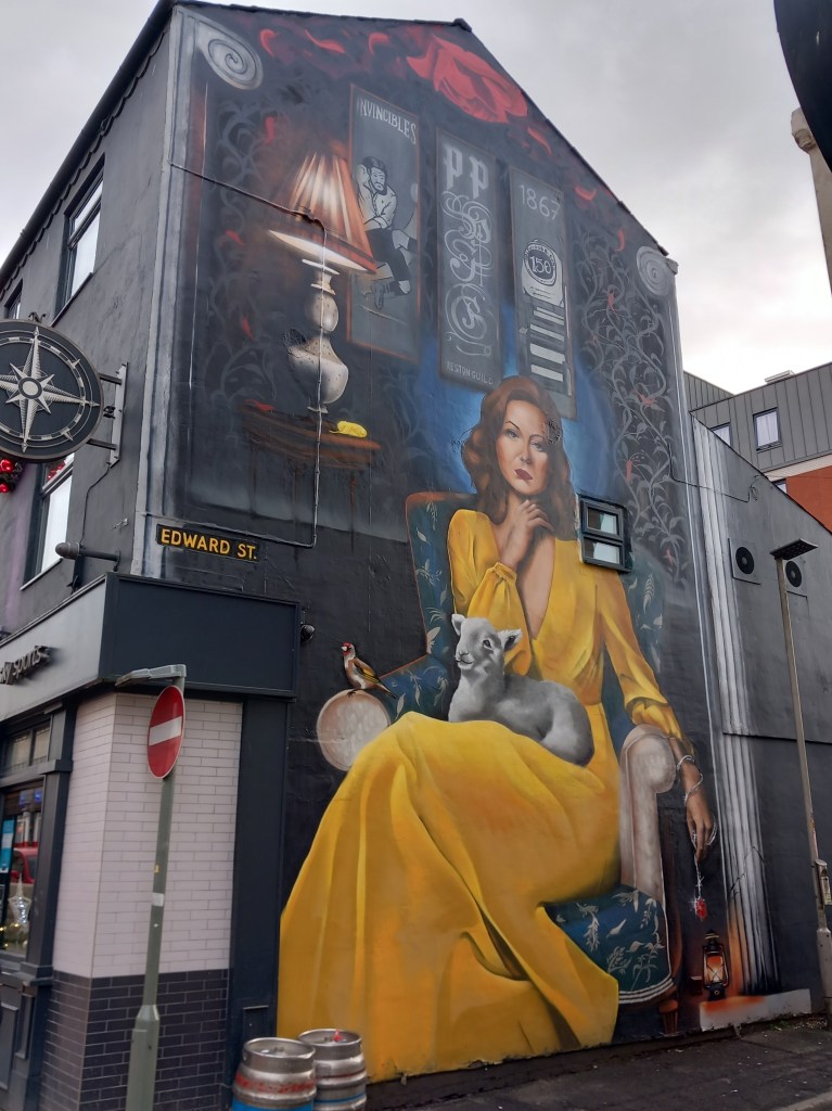 The third Shawn Sharpe mural on this walk has a solidly historical theme, featuring one of Preston’s most familiar paintings, a re-imagining of Pauline in the Yellow Dress. This hangs in the Harris Museum and Art Gallery, and was bought for the town in 1944. It has recently been dubbed Preston’s most popular painting by the BBC. On this mural, Shawn has once again featured the Preston lamb, sitting in Pauline’s lap, substituting it for her white lap dog in the original. From one of her hands dangles a bracelet, with a small Lancashire red rose on it.