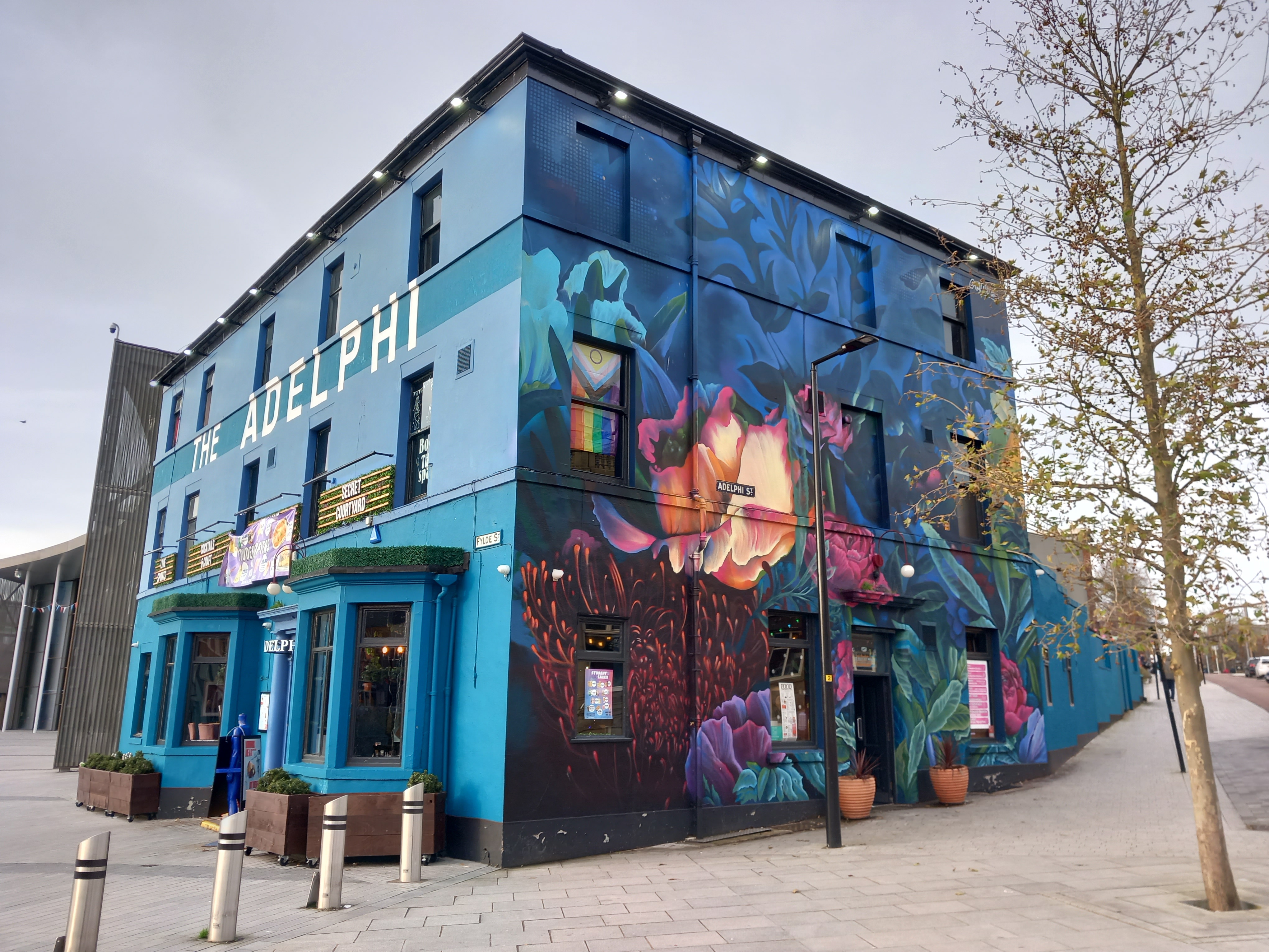 The Adelphi has a stunning flora mural on the side of the building. This was part of an extensive refurbishment in 2021. Floral themed murals are becoming increasingly popular form of decoration for bars and pubs, but are usually on the inside of the premises.