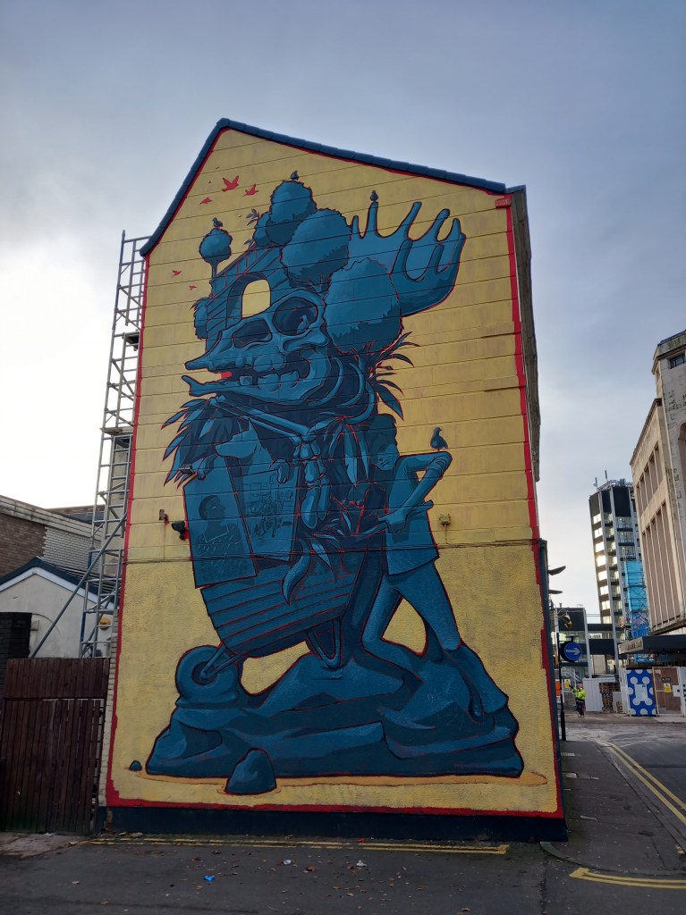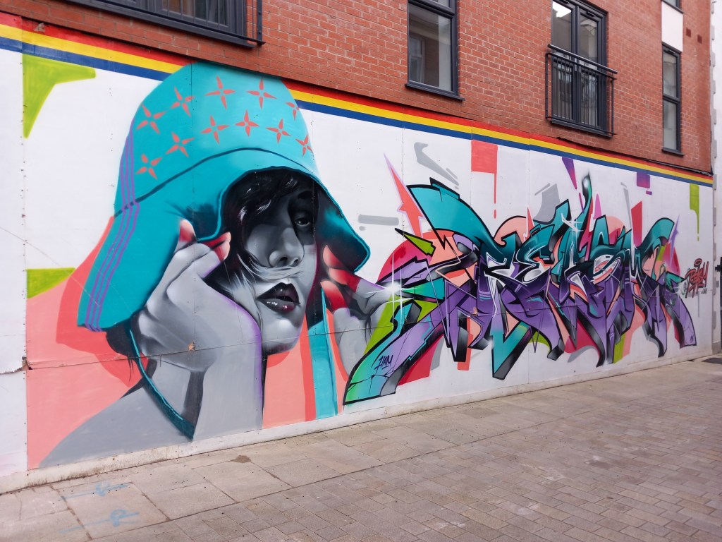 The mural was created by Chris Dorning, and he describes it as an “homage to Preston”, based on memories of his life in city. As with the above mentioned Mile 0/21, this was part of the original Paint Preston project. Completed in early 2022, it shows key places and objects of inspiration to Chris, all piled up in a big wheelbarrow. At the top of the painting is an archway from Avenham Park where he was a frequent visitor, running, walking his dogs and playing with his family.