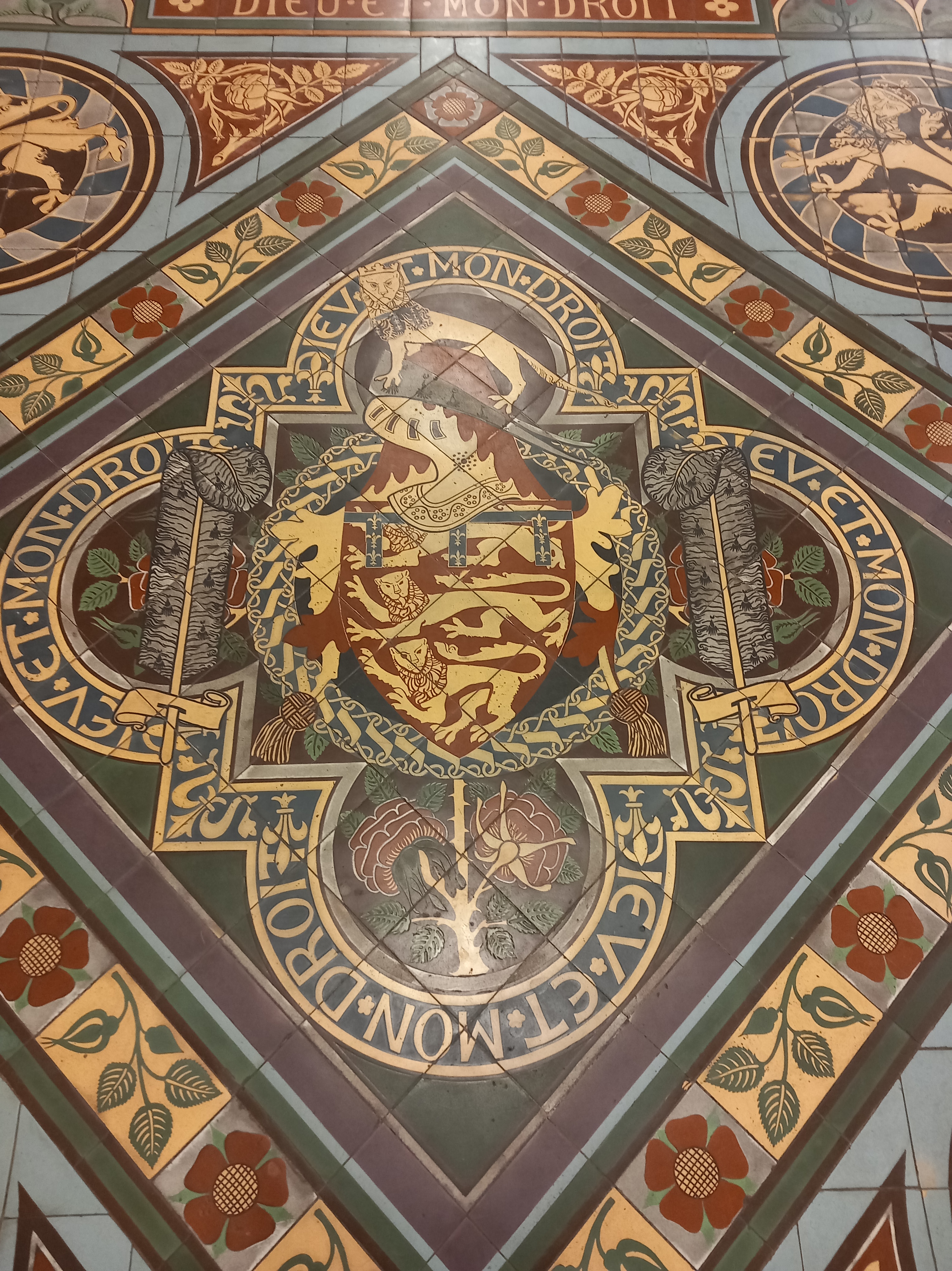 The floor tiles form twenty-one decorated squares with borough, county and royal coats of arms and crests. They were designed by Clement Heaton and produced at the famous tile works of Minton, Hollins & Company in Stoke on Trent.