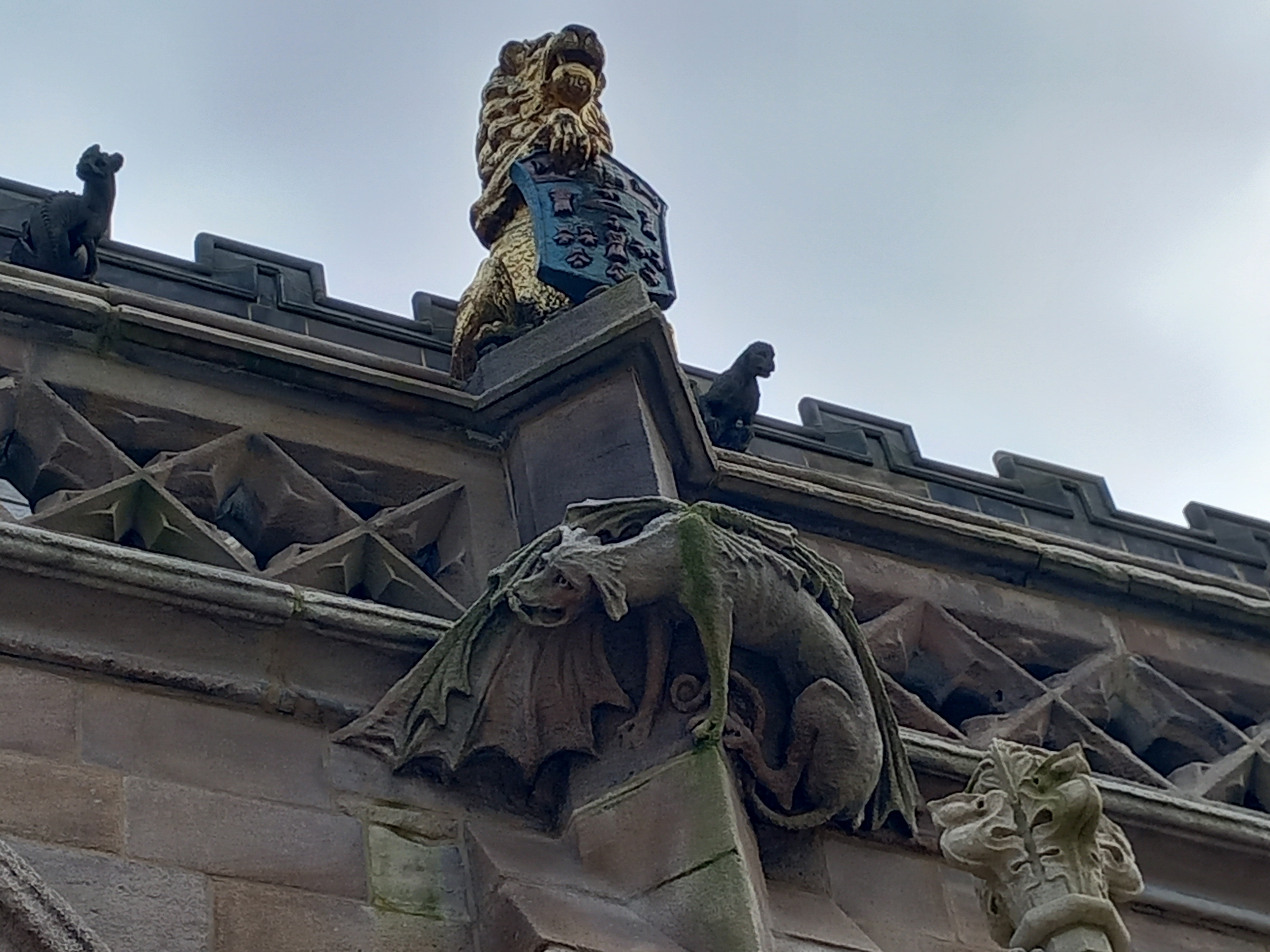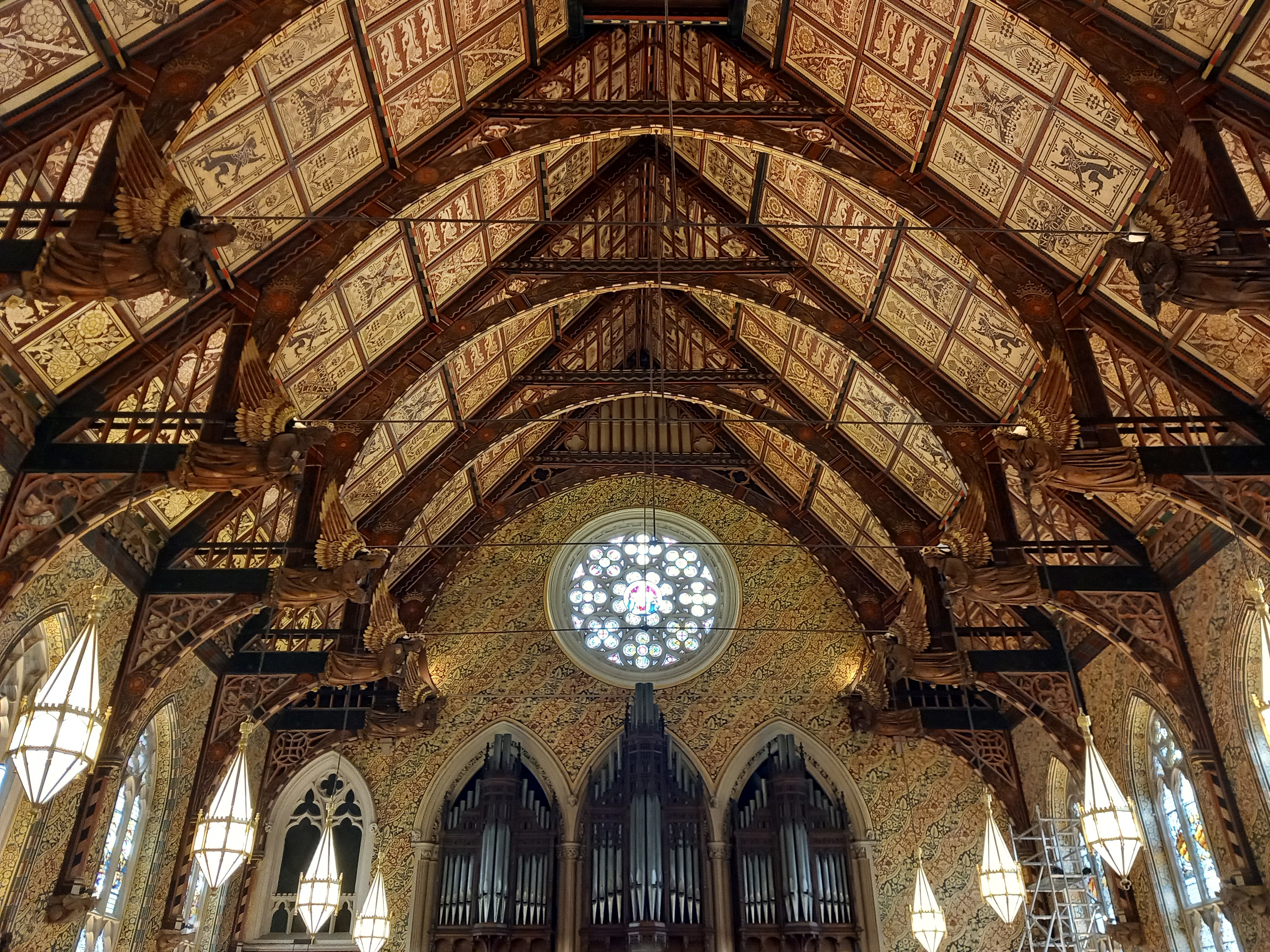 The architectural style Crossland used is known as Gothic Revival, at its peak in the late 1800s, and looked back to the designs of the Medieval past. This style can also be seen at Manchester Town Hall and Manchester Assize Courts. For the interior, Crossland also used elements from the Arts and Crafts movement which uses natural imagery of plants and animals.