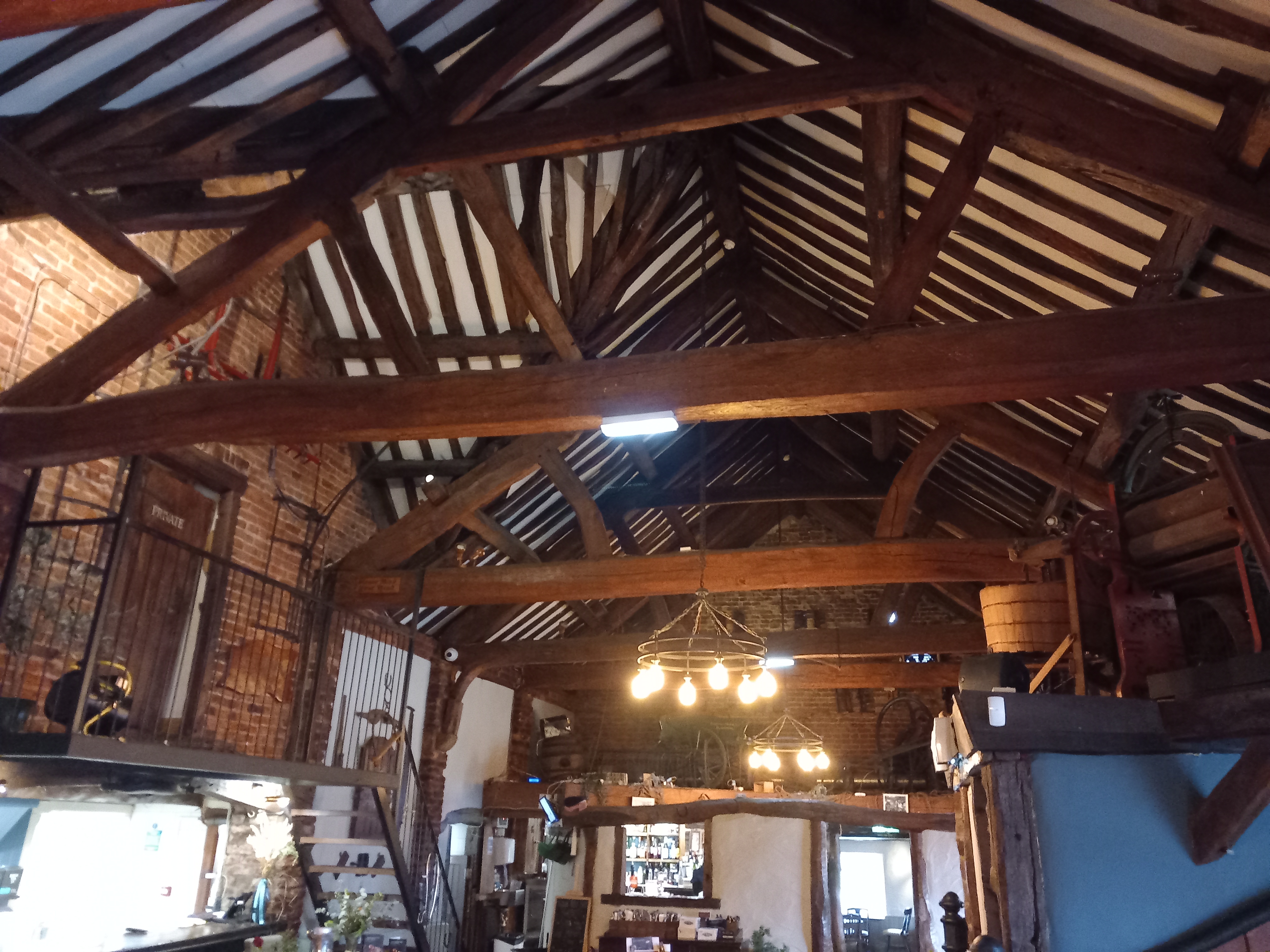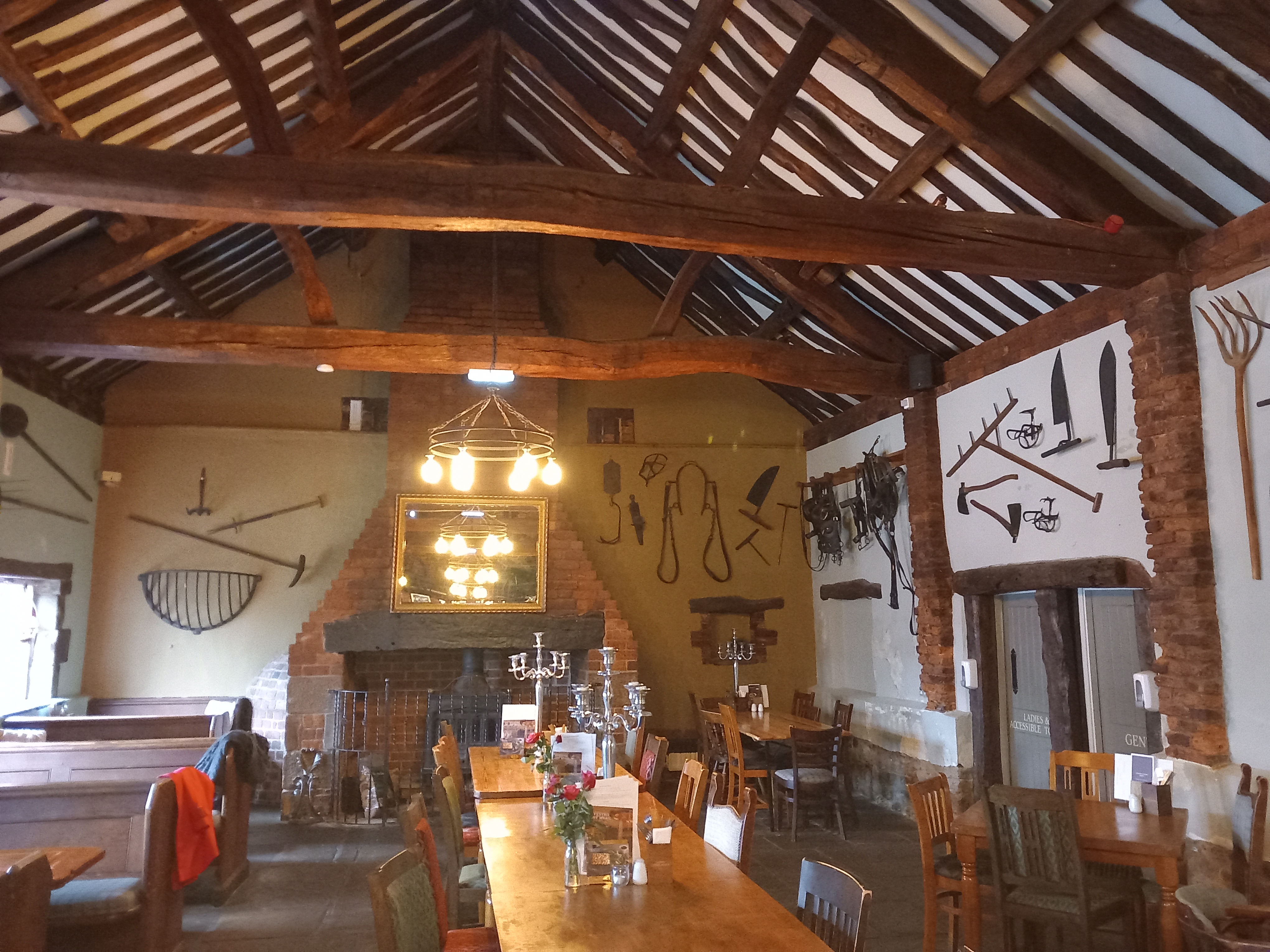 In 1973, John Wilding bought the barn and set it up as a pub and restaurant that displayed a host of agricultural implements. These are still on display today. Visitors can gaze up at tools and machinery while they eat and drink, and try to work out what they were used for. Some are obvious such as the picks, pitchforks and horse tackle, but other pieces have more obscure uses. Larger items such as hand carts, fruit presses and ploughing machinery are also on show. The store sign from local cloggers T Clarkson & Son of Bridge Street is also displayed, and from Harry Wilkinson, a wood turner from Forton, what looks like a complete set of tools can be seen. An old map that shows the field system of Garstang (a tithe map?) is also worth close inspection.
