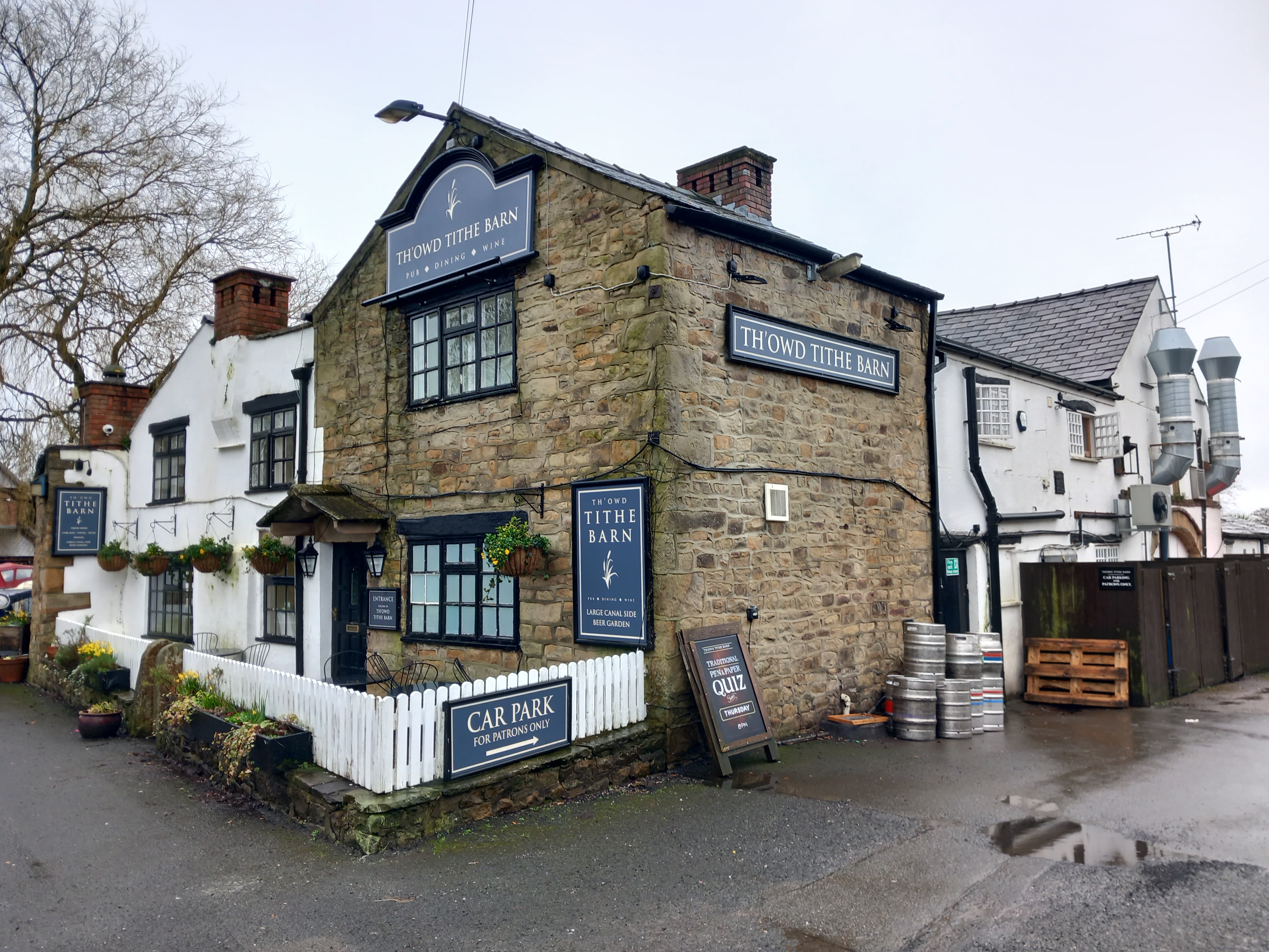 Th’Owd Tithe Barn is a popular pub located on the Lancaster Canal, with narrowboats moored alongside it in Garstang Basin. Its name suggests that it was a place for collecting tithes, these being a tenth of the produce a farmer gave to the church in tax. While the building certainly has the hallmarks of being a barn, whether it was an actual tithe barn will be discussed below. Its association with the Lancaster Canal is also not clear, with the basin it stands by labelled as a canal wharf on old maps.
