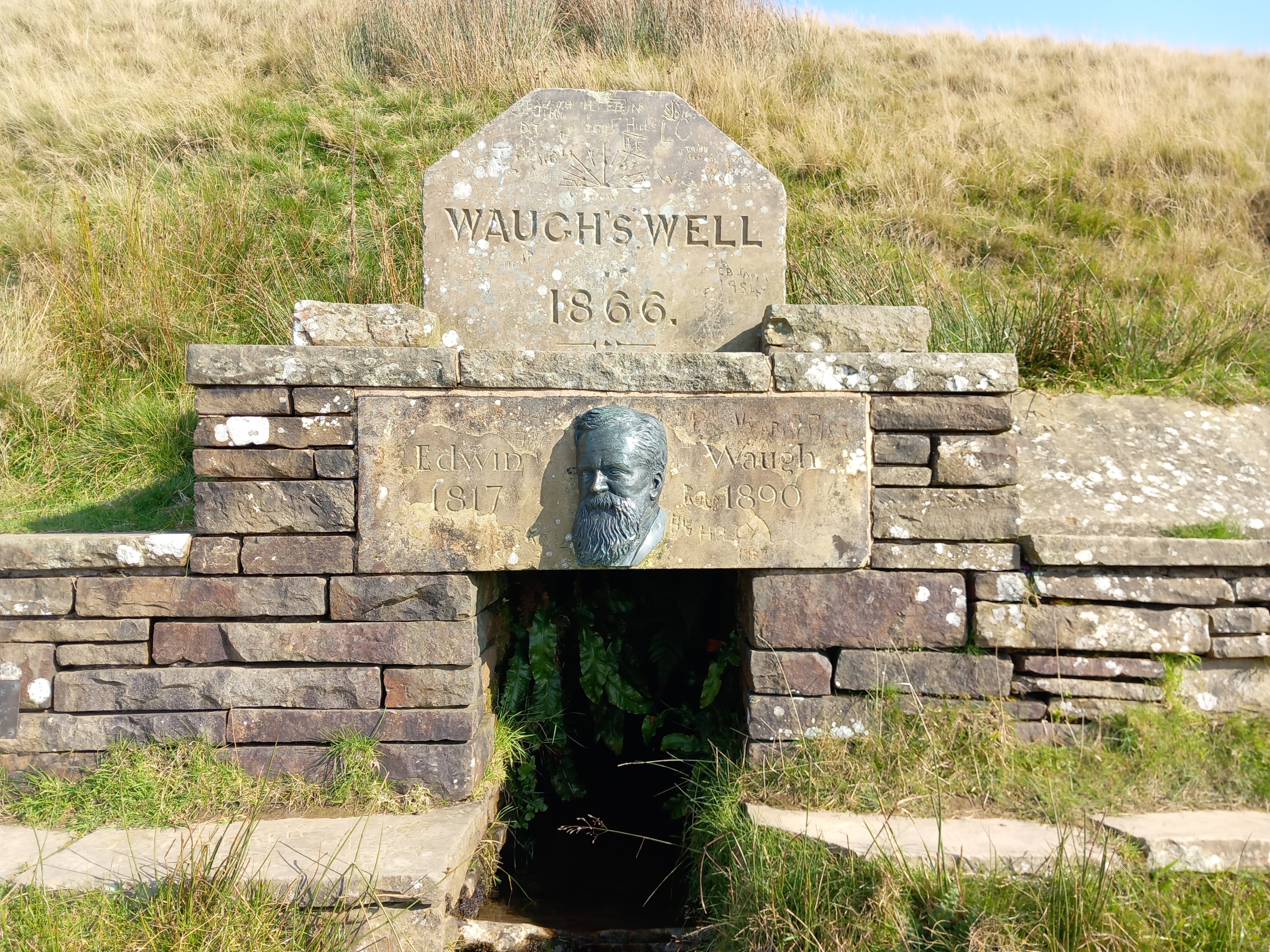 Waugh’s Well is built around a natural spring, high up on Scout Moor. It was a favourite place of Lancashire’s most famous dialect poet, Edwin Waugh. Born in Rochdale in 1817, Waugh rose from humble origins to become a chronicler of the lives, hardships and landscapes of the Lancashire working class. Perhaps surprisingly, the well was dedicated to him within his own lifetime, and remains now a place of frequent pilgrimage some 150 years after its construction.