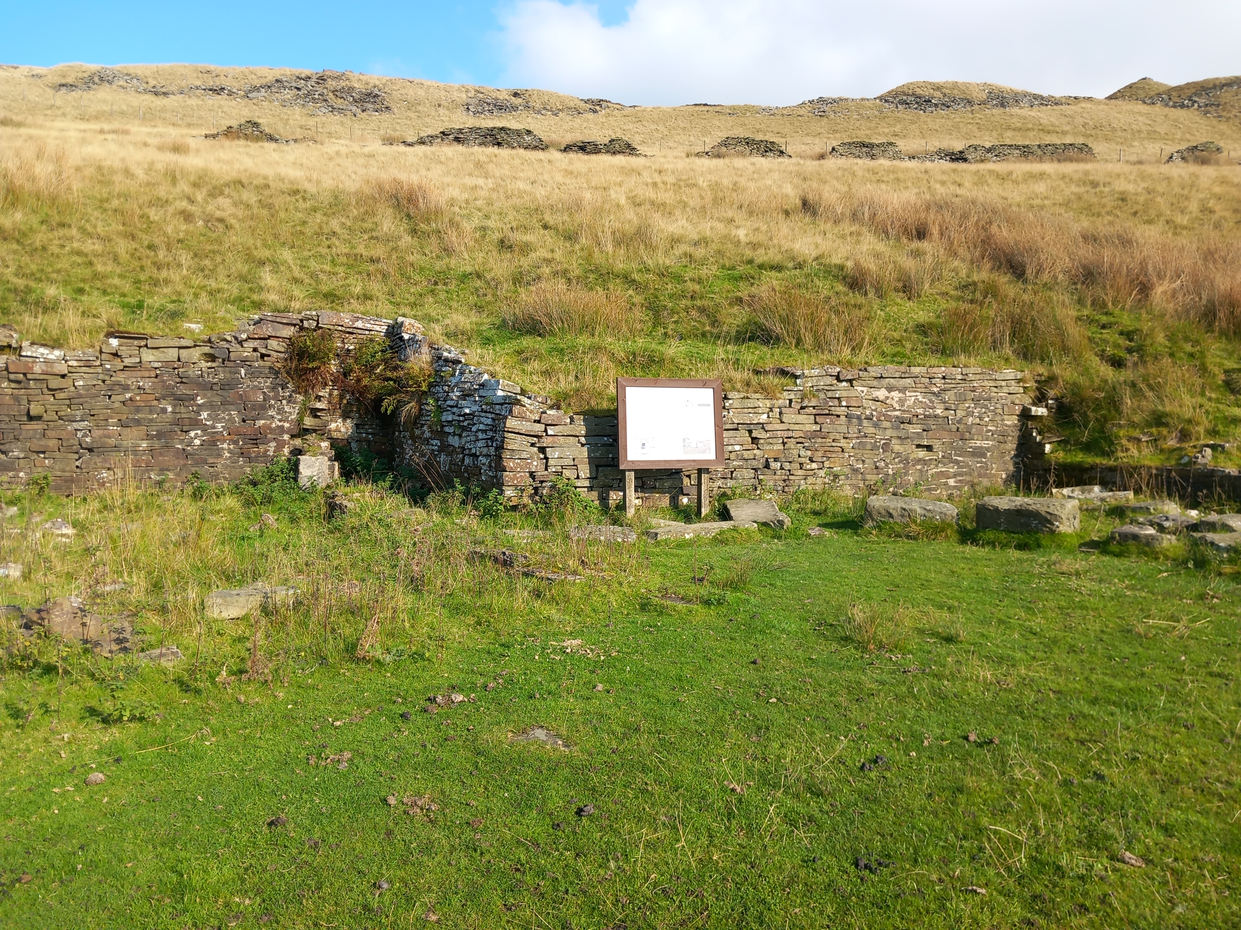 On New Years Day in 2022, local business man Matthew Kendall saw that the interpretation board at Foe Edge Farm ruins was missing its lower half. He contacted both the Edwin Waugh Dialect Society and landowners United Utilities to see about getting a new board installed. In July the next year, Matthew, together with John Pye (the publicity officer for the society) and Graham Barnes, whose father had been the reservoir warden when he lived at Foe Edge Farm, did a reconnaissance trip to the site. A month later, the newly designed board was ready to be installed. Matthew kept the wording as close to the original as possible, but added an updated map and a QR code link to the Edwin Waugh Dialect Society website. He drove his vehicle as close as he could, presumably using the access road to Scout Moor turbines. Then he strapped the sign to his back and carried it along the winding moorland footpath. It is now installed by Foe Edge Farm ruins, and explains the importance of the farm and the well in the life of Edwin Waugh.
