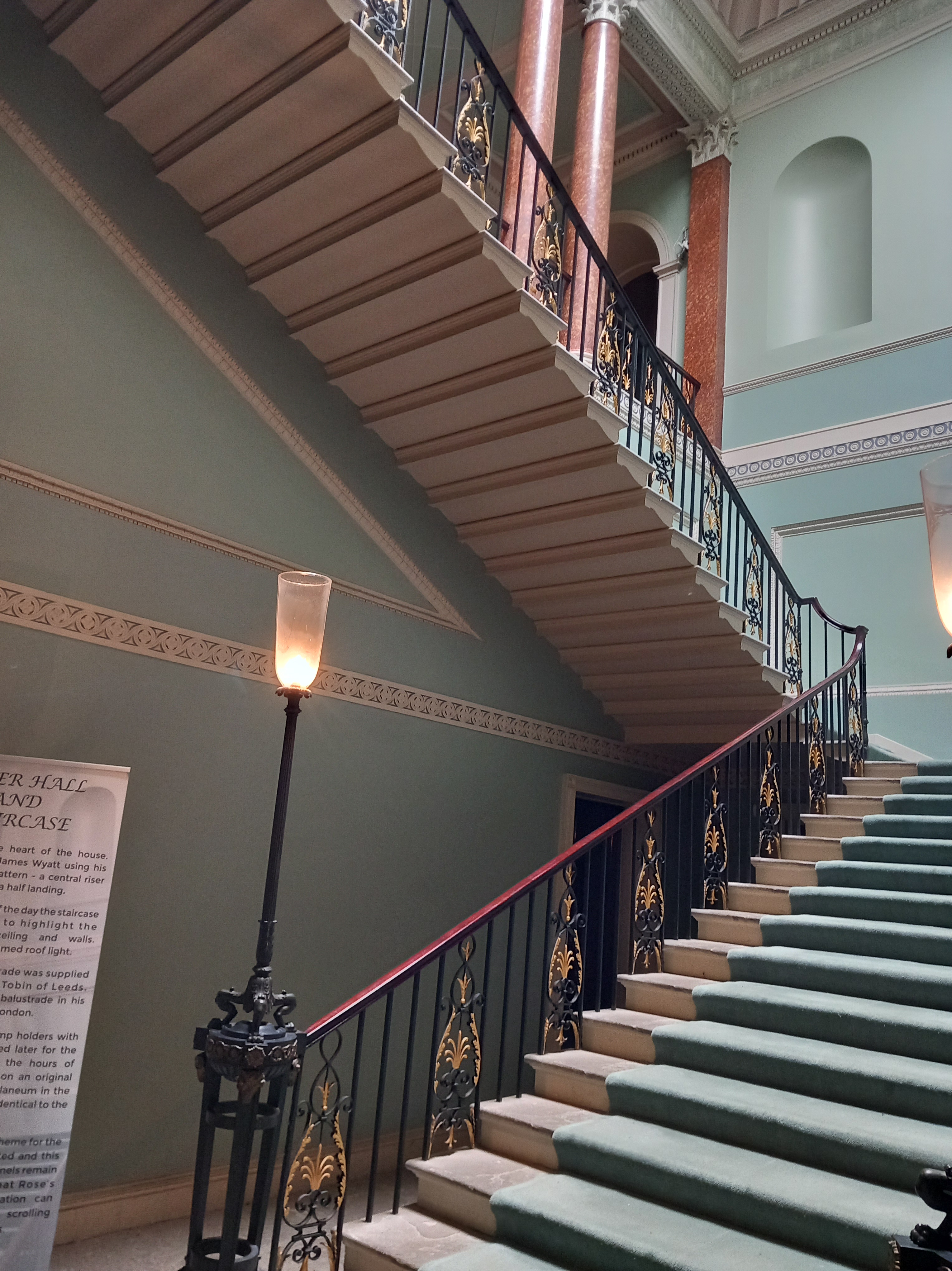 The Stairhall features James Wyatt’s elaborately designed wrought-iron staircase, illuminated from above by a domed roof light. This room lead through to the suite of three south-facing reception rooms: the Saloon, Billiard and Dining Room. All three of these have decorated plasterwork by Joseph Rose the younger of York, featuring fluted fans, ears of wheat and honeysuckle flowers.
