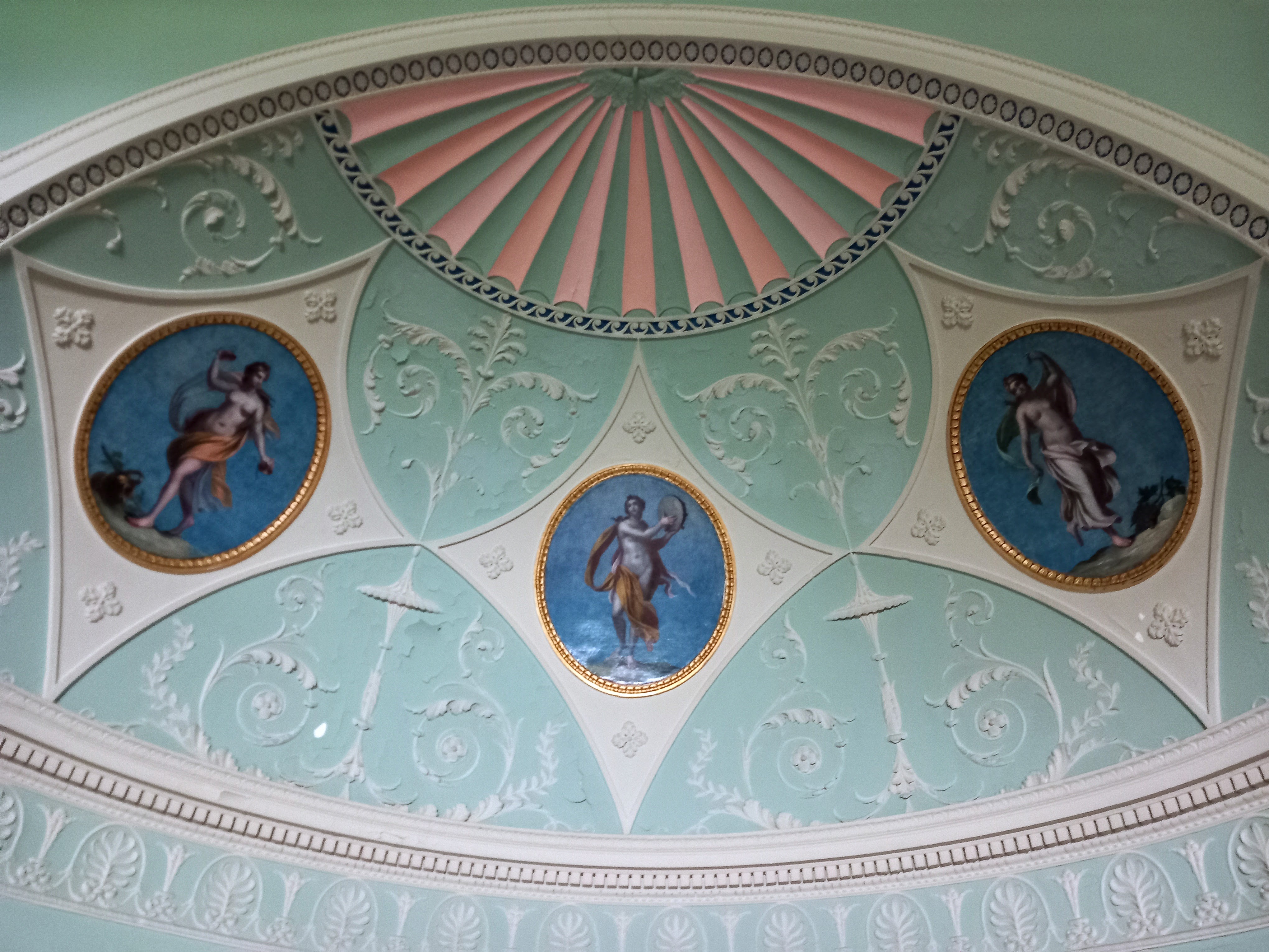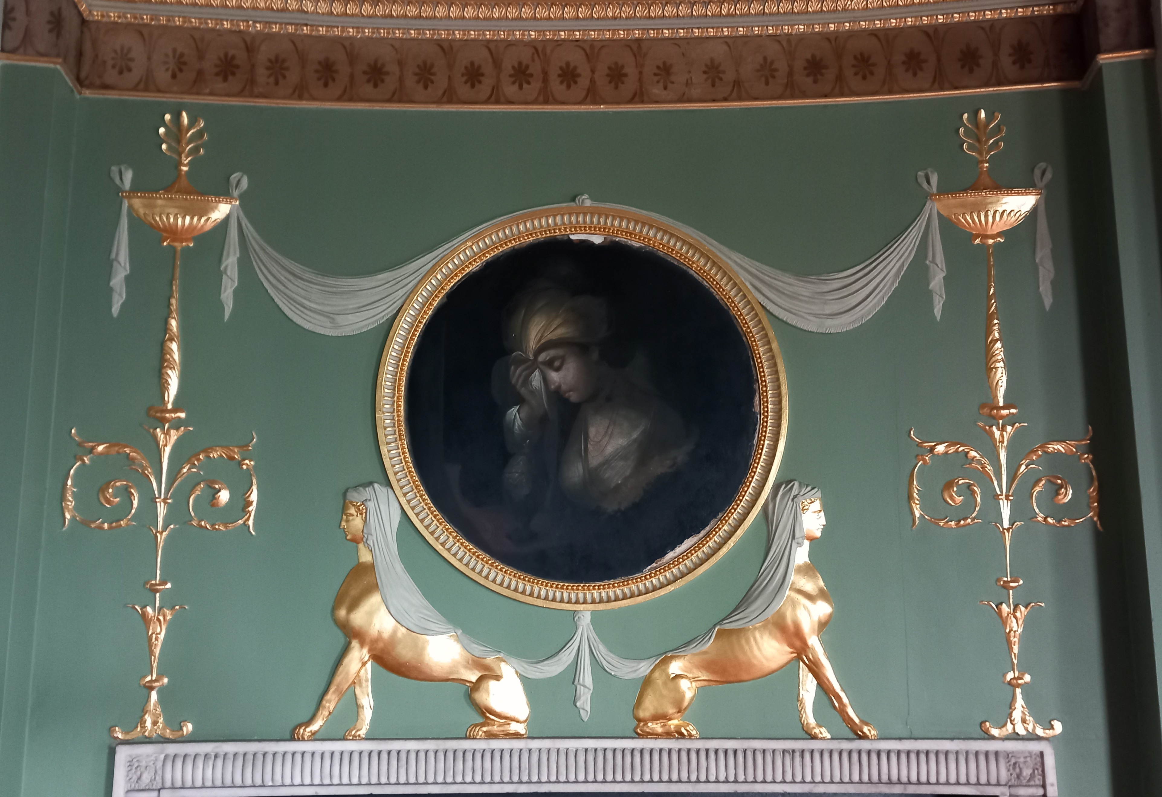 Upstairs is the circular Cupola Room, topped by a dome. It served as a drawing room for Thomas Egerton’s mother. The decoration of the room was again created by Biagio Rebecca. He painted designs in oil onto strips of paper, measuring just 10 inches by 5 inches, and then pasted them up onto the pilasters. On the dome the outer area shows ‘The Virtues’ and the inner area ‘The Elements’. The painting over the fireplace is meant to symbolise the virtuous widow, and is Sigismunda Weeping over the Ashes of Tancred.